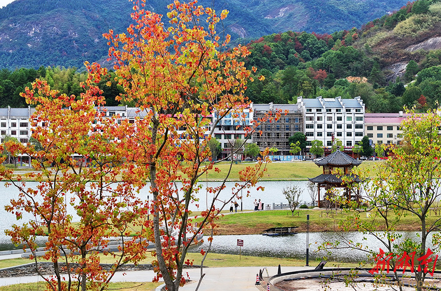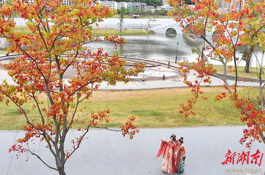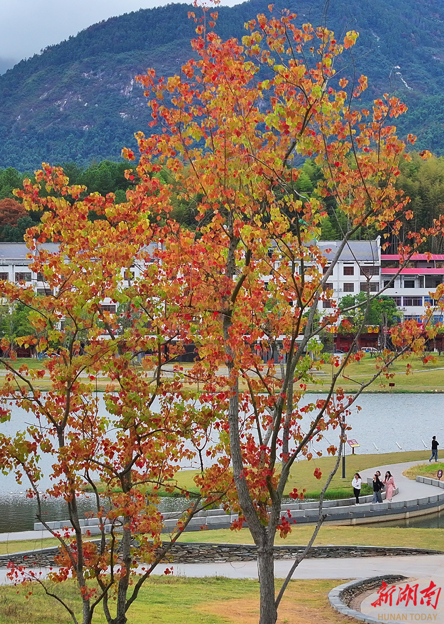 10月19日,游客在衡阳市南岳区金月湖畔赏景游玩。深秋时节,湖畔层林尽染,与湖水相映成趣,构成一幅绚丽的秋日画卷,吸引众多游客驻足观赏。 曹正平 文兰 摄影报道(湖南图片库)