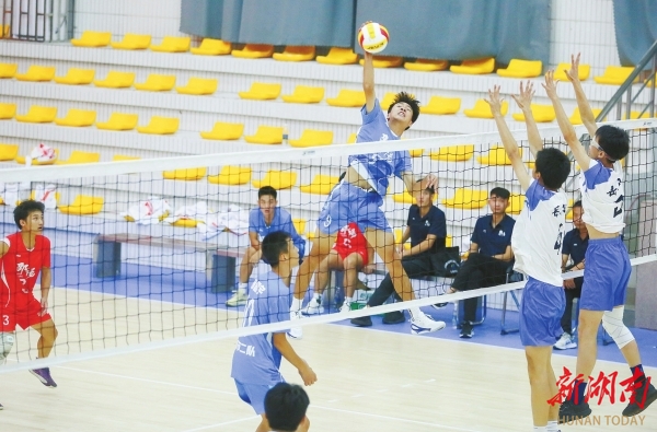 10月18日,隆回县第二中学,岳阳队与邵阳二队在比赛中。当天,湖南省第六届中学生运动会排球比赛在隆回县开赛。