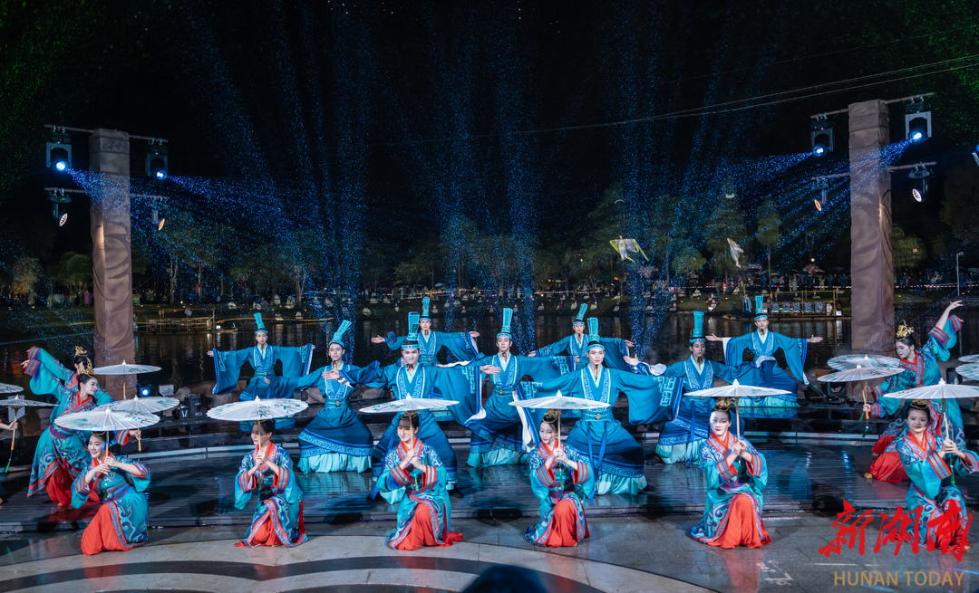 电动竹筏静谧巡游,再现舜帝南巡意境;曼妙的瑶族伞舞翩跹而起,舞动着民族传承的韵律;深沉的长鼓声声入耳,回荡着对美好生活的祈愿……19日晚,漫步南风集,流光溢彩,全域成为表演舞台,上演一场跨越时空的文旅盛宴。
