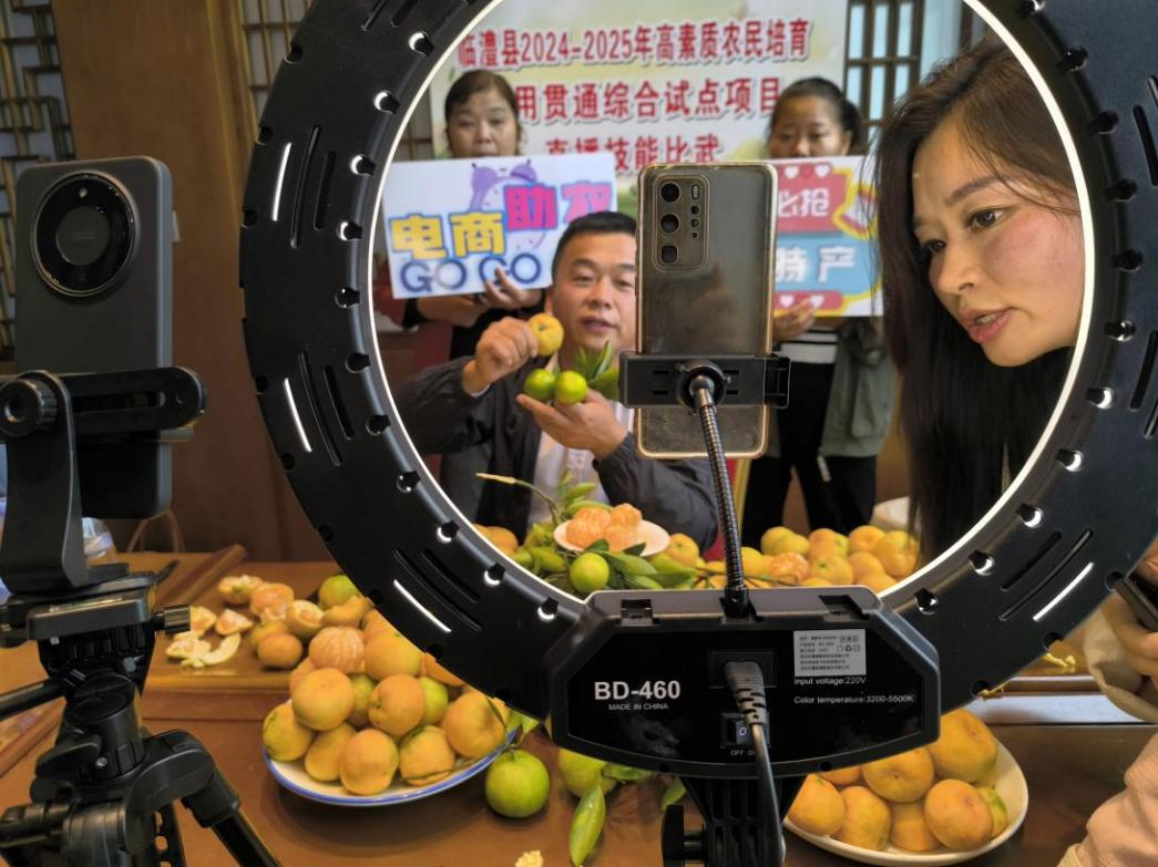 “电商助农,一起行动。家人们,快来尝尝产自咱们临澧的柑橘,今年的水分比去年更足。” “老乡,这是临澧特产鲊辣椒,全都是菜籽油炒的,还放了白芝麻”……10月16日,伴随着主播们此起彼伏的热情吆喝,常德临澧县2024-2025年高素质农民培育学用贯通综合试点项目直播技能比武在临澧县福船农庄举行。