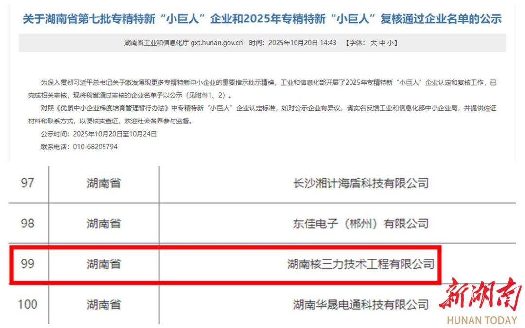 湖南日报·新湖南客户端10月21日讯(通讯员 李智勇 胡国余)近日,工业和信息化部正式公示第七批专精特新“小巨人”企业及2025年专精特新“小巨人”复核通过企业名单,衡阳市蒸湘区湖南核三力技术工程有限公司(以下简称“核三力”)凭借过硬的技术实力、突出的创新能力与深厚的产业积淀,成功通过复核。