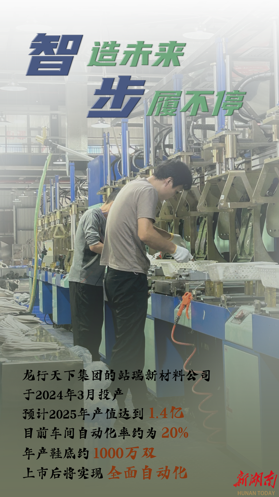 龙行天下集团旗下的站瑞新材料公司,专注于为国际知名品牌生产鞋用EVA中底,2024年3月投产即快速步入正轨,预计2025年产值达1.4亿元。企业高度认可衡阳县政府“有呼必应、随叫随到”的服务精神,尤其在建厂初期,环保部门主动提供全流程清单式指导,贴心服务解决了企业后顾之忧。目前公司正增资扩建生产线,向技术含量和产值更高的“爆米花”中底领域进军,自动化水平将持续提升。