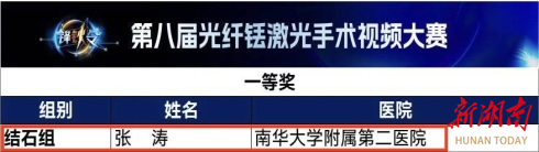 湖南日报·新湖南客户端10月21日讯(通讯员 唐剑峰)近日,在代表国内泌尿系结石微创治疗顶尖水平的“锋钬令”第八届光纤铥激光手术视频大赛全国总决赛上,南华大学附属第二医院泌尿外科结石亚专业负责人、主任医师张涛教授凭借精湛技艺,在激烈竞争中胜出,荣获大赛最高奖项。这一荣誉既是对张涛个人技术实力的权威认可,也标志着该院泌尿外科在结石诊疗领域已跻身国内先进行列。