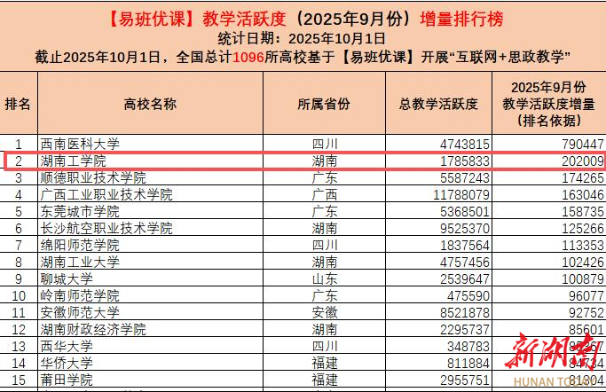 湖南日报·新湖南客户端10月21日讯(通讯员 汪雯露 李琪)近日,教育部易班发展中心公布2025年9月“易班优课”教学活跃度增量排行榜,湖南工学院在全国基于【易班优课】开展“互联网+思政教学”的1096所高校中表现出色,位列全国第二、湖南省高校第一,再次展现出该校在“互联网+思政教学”领域的强劲实力。