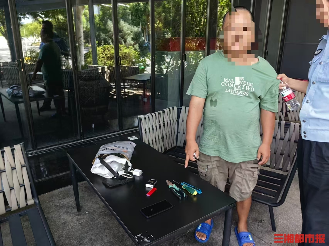 接警后,湖南湘江新区公安局岳麓派出所民警李鹏举、辅警刘成迅速赶到现场,立即调取周边公共视频进行排查。监控视频画面显示,在周先生转身的间隙,一名在店外躲雨的光头男子,见四下无人关注,看见手机单独摆放在竹筐后,迅速将其揣入怀中,随后快步离开现场。