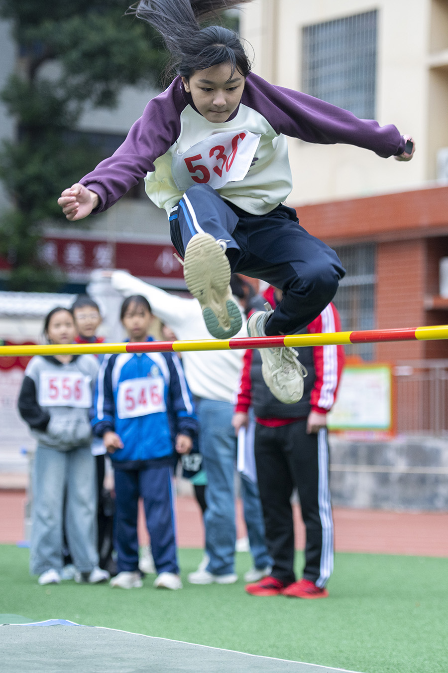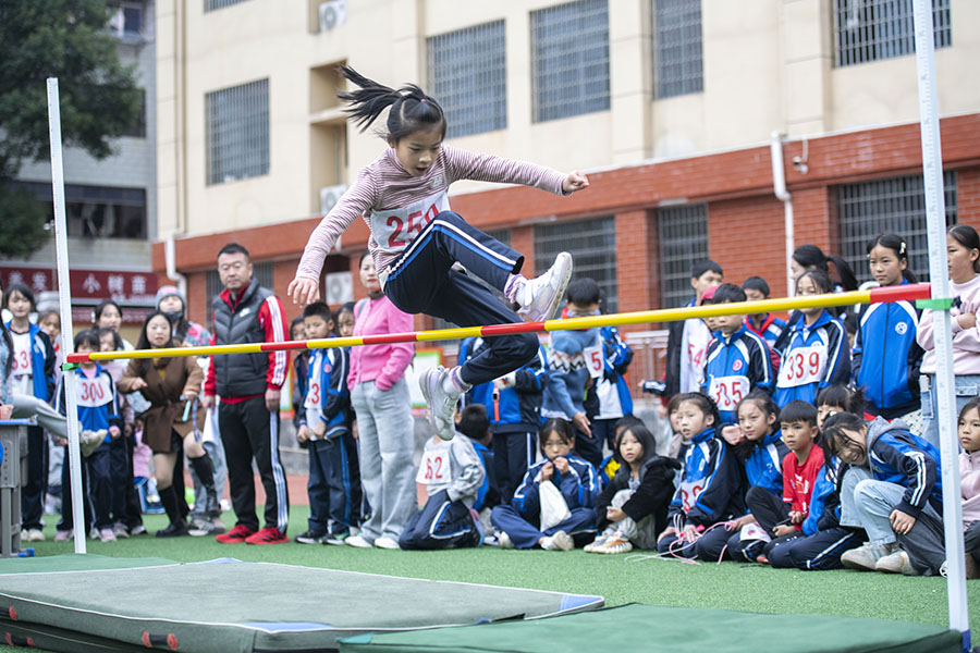 10月21日,学生在参加跳高比赛。当天,娄底市娄星区第五完全小学举行秋季运动会。学生们在体育项目中强健体魄、磨炼意志,展现阳光向上的精神风貌。 吴永华 摄(湖南图片库)