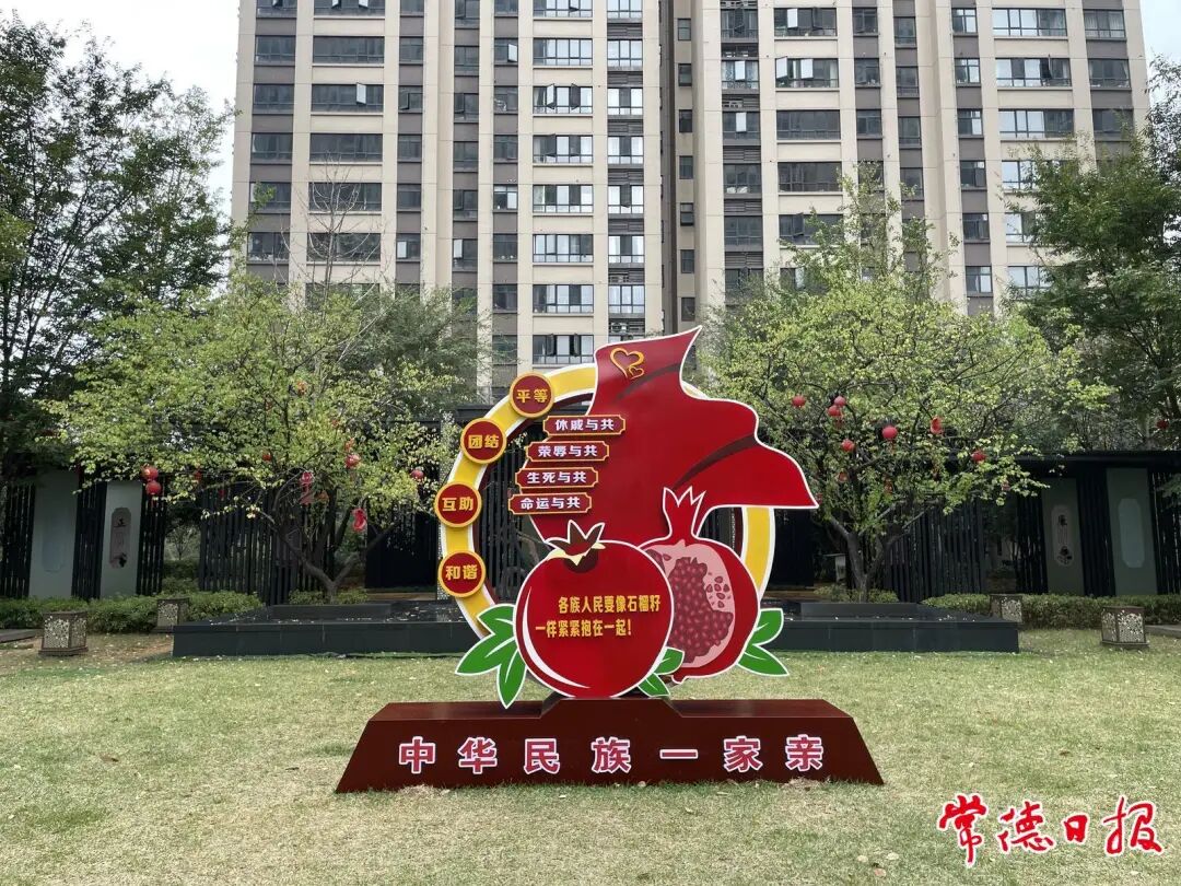 在南金城小区,民族团结的氛围处处可见:象征着民族团结的红石榴雕塑屹立中央,56个民族的简介装点着回廊,树枝上悬挂的石榴“名片”讲述着各民族的故事。小区物业经理李应爱介绍,每逢佳节,小区都会开展送月饼、磨菜刀、免费理发等惠民活动。