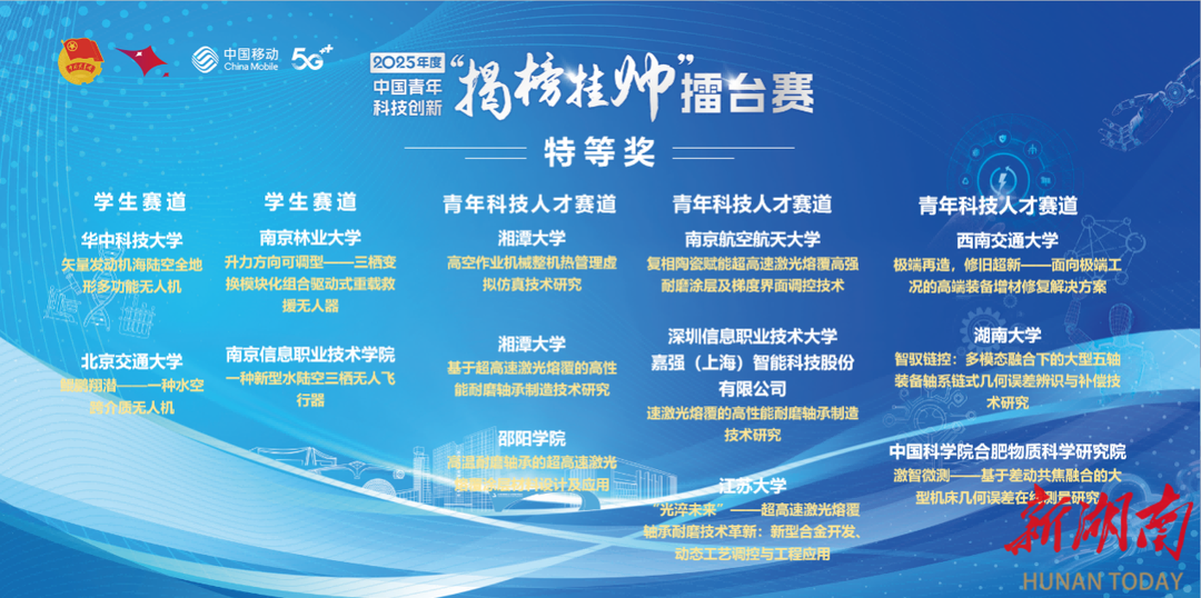 湖南日报·新湖南客户端10月22日讯(通讯员 刘翔 郭津铄 蔡嘉敏 陈祉昂)近日,2025年度中国青年科技创新“揭榜挂帅”擂台赛“高端装备领域”终审主擂台赛在长沙落下帷幕。赛事共发布19个榜题,设学生赛道和青年科技人才赛道,湘潭大学2个项目在青年科技人才赛道中脱颖而出,荣获特等奖。