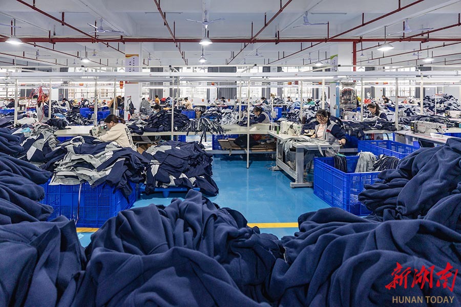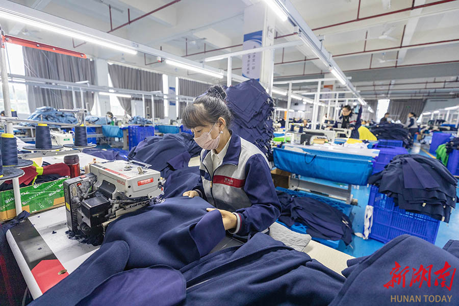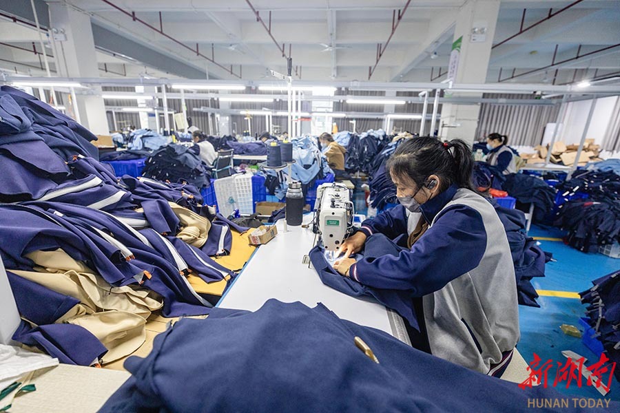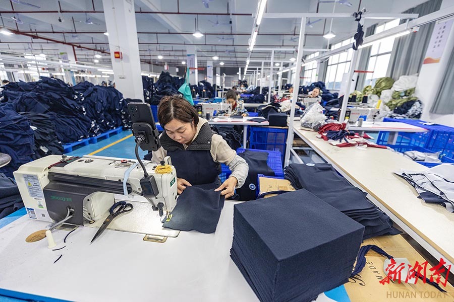 10月21日,吉首经开区湘西百裕服饰有限公司生产车间,工人在赶制服饰订单产品。作为一家集设计研发、生产制造、销售服务于一体的综合性服装企业,该公司专注于学生装、职业装及运动休闲服饰领域。当前,企业正开足马力组织生产,全力保障订单产品按时保质保量交付。彭璟 摄(湖南图片库)