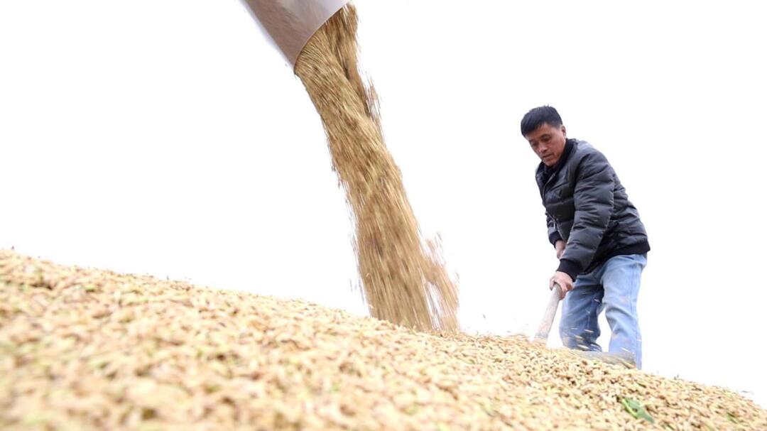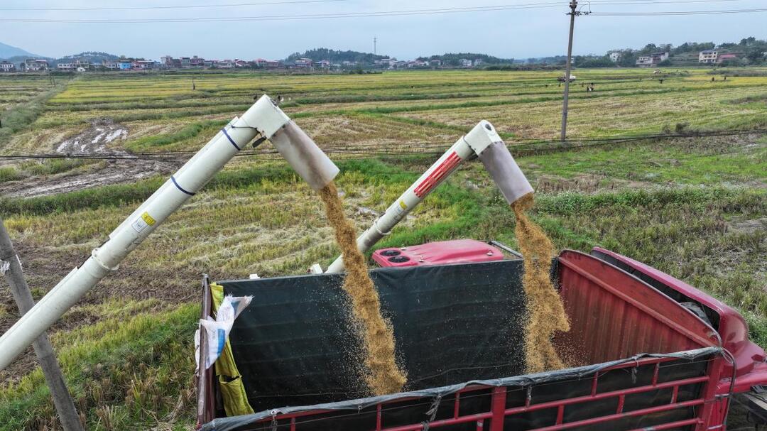 在邵阳县五峰铺镇燕塘村的田垄里,种植大户刘新华正组织工人抢抓晴好天气收割稻谷,今年他种植了450多亩双季晚稻,实行订单式种植,耕作全部机械化。收割现场,三台收割机在田里“奔跑”,颗颗饱满的谷粒被“吃”进收割机,再通过巨大的“手臂”转送至田埂道上汽车“仓库”中,机械化全田低茬收割,让稻秆粉碎还田,变成来年水稻底肥。“晚稻都是集中育秧,全部是机插,产量在1000多斤一亩,恒丰优金丝苗,优质米。”种粮大户刘新华说。