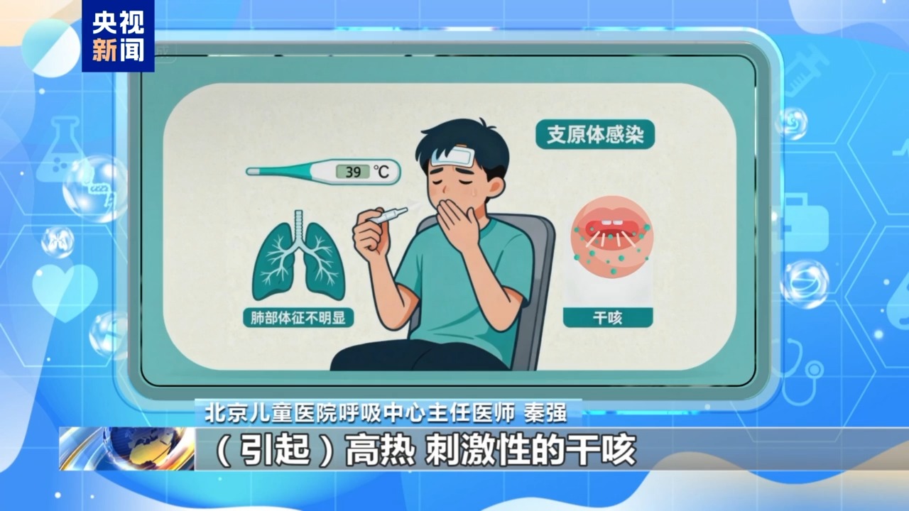 北京儿童医院呼吸中心主任医师 秦强:合胞病毒的危害在于它会引起小婴儿,特别是两岁以内儿童出现呼吸道重症的风险,症状早期可能不典型,但是会进展比较快。支原体感染以后, 引起高热、刺激性的干咳,但是肺部体征不明显,可能几天以后去拍胸片,发现病变范围很大。肺炎链球菌,最典型的症状是咳铁锈色痰,痰里带着血丝。