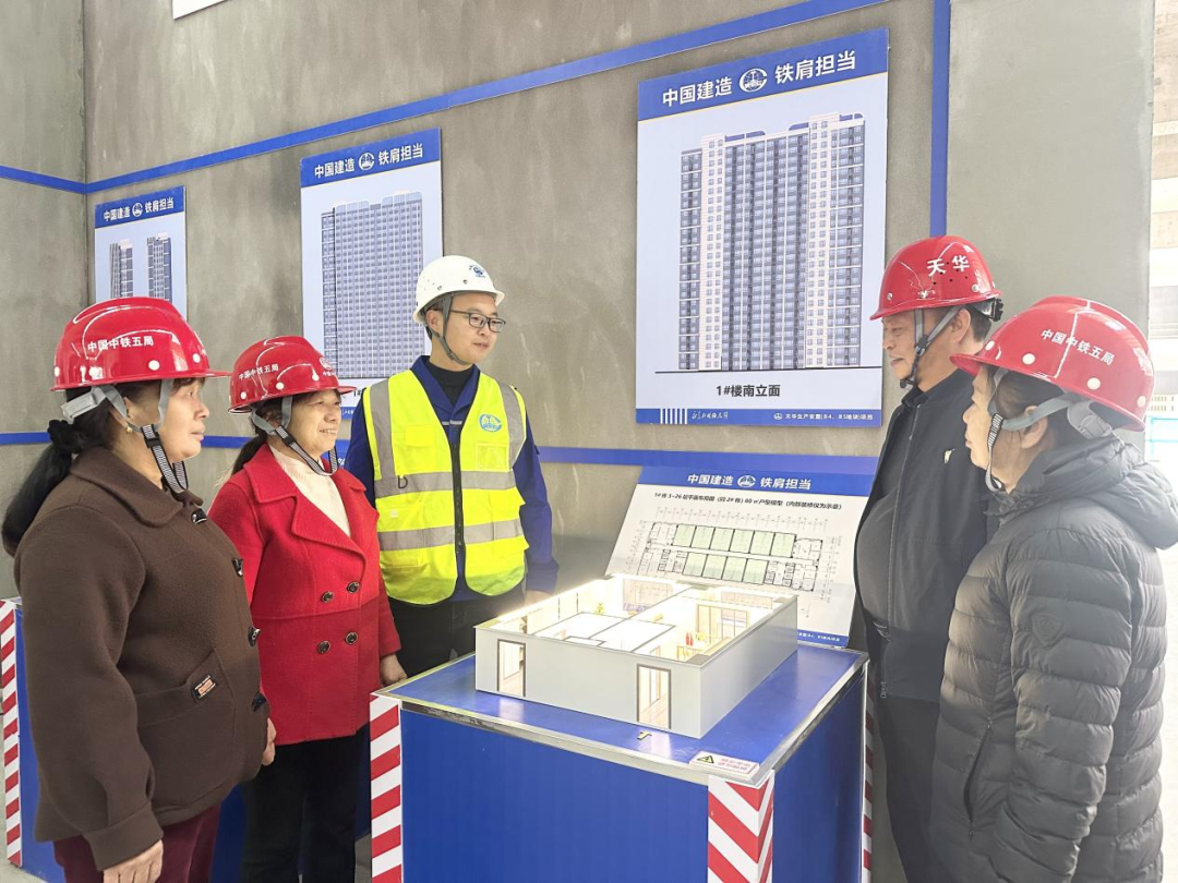 此次面向村民开放的是天华生产安置项目B5地块,工地现场设置有沙盘模型和图片展板,村民们做好各项安全保障后,详细了解建筑规划、施工技术、户型设计、质量管理等情况。洞井街道天华股份经济合作社和中铁五局的工作人员耐心解答村民提出的地砖铺设、工艺制作、防水处理等问题。村民杨军元用手轻抚着平整细腻的墙面,不停地称赞施工质量,“从满心期待到眼见为实,看到新房建得好,让我不再疑虑和担忧,能在现场提前知道房屋结构、物料材质、建设进度,心里踏实多了。”