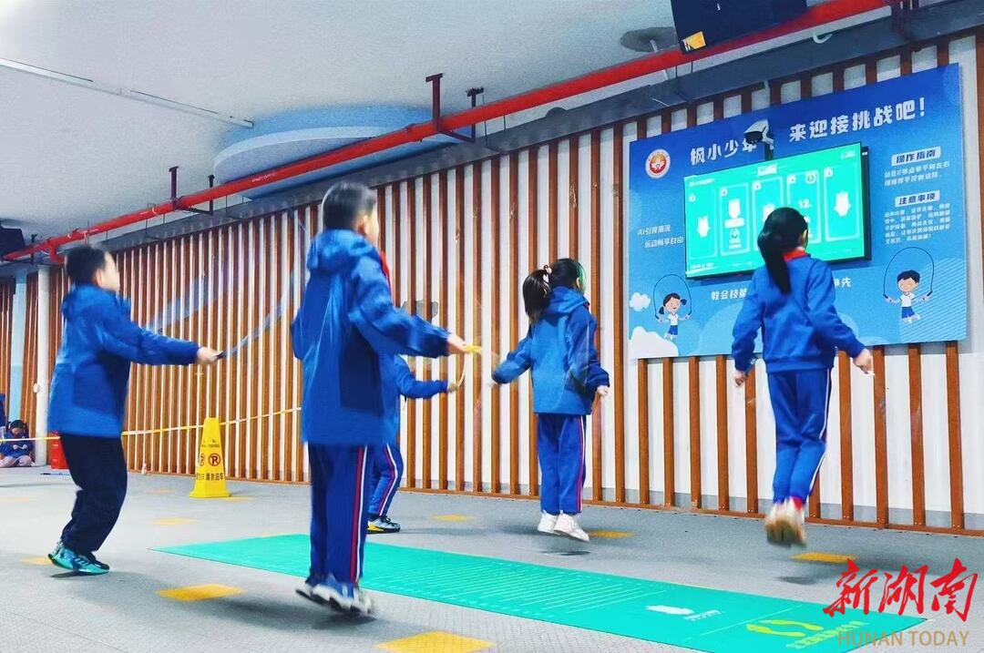 在枫树山小学的“智慧体育角”,学生们正围绕AI体能设备进行跳绳测试。随着屏幕上数字的跃动,成绩自动上传系统,并在年级排行榜上实时更新。