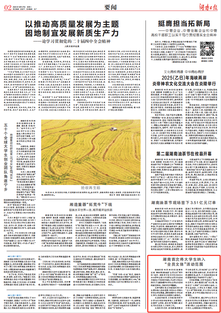 湖南日报10月26日讯(全媒体记者 蒋诗雨)湖南省“全员文体”再升级!近日,省教育厅正式印发《2025—2026学年全省大中小学生全员文体活动方案》(以下简称“方案”)。与去年8月出台的《关于全面加强中小学生全员文体活动的意见》相比,首次将大学生群体纳入活动范围,实现从小学到大学的全学段覆盖。同时鼓励中小学生家长参与,构建家校社协同育人新模式。