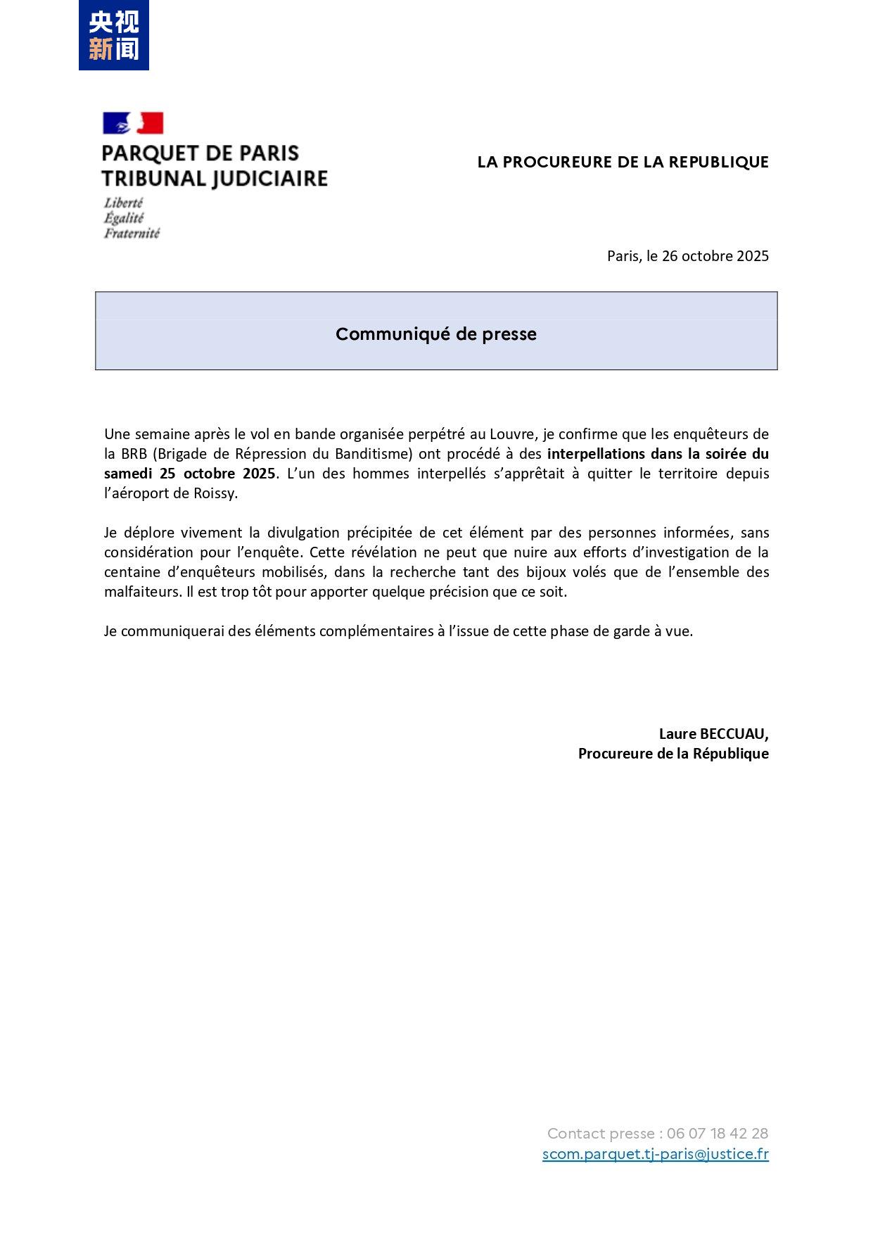 当地时间26日,巴黎检方发表声明,确认卢浮宫抢劫案已有嫌疑人被捕。