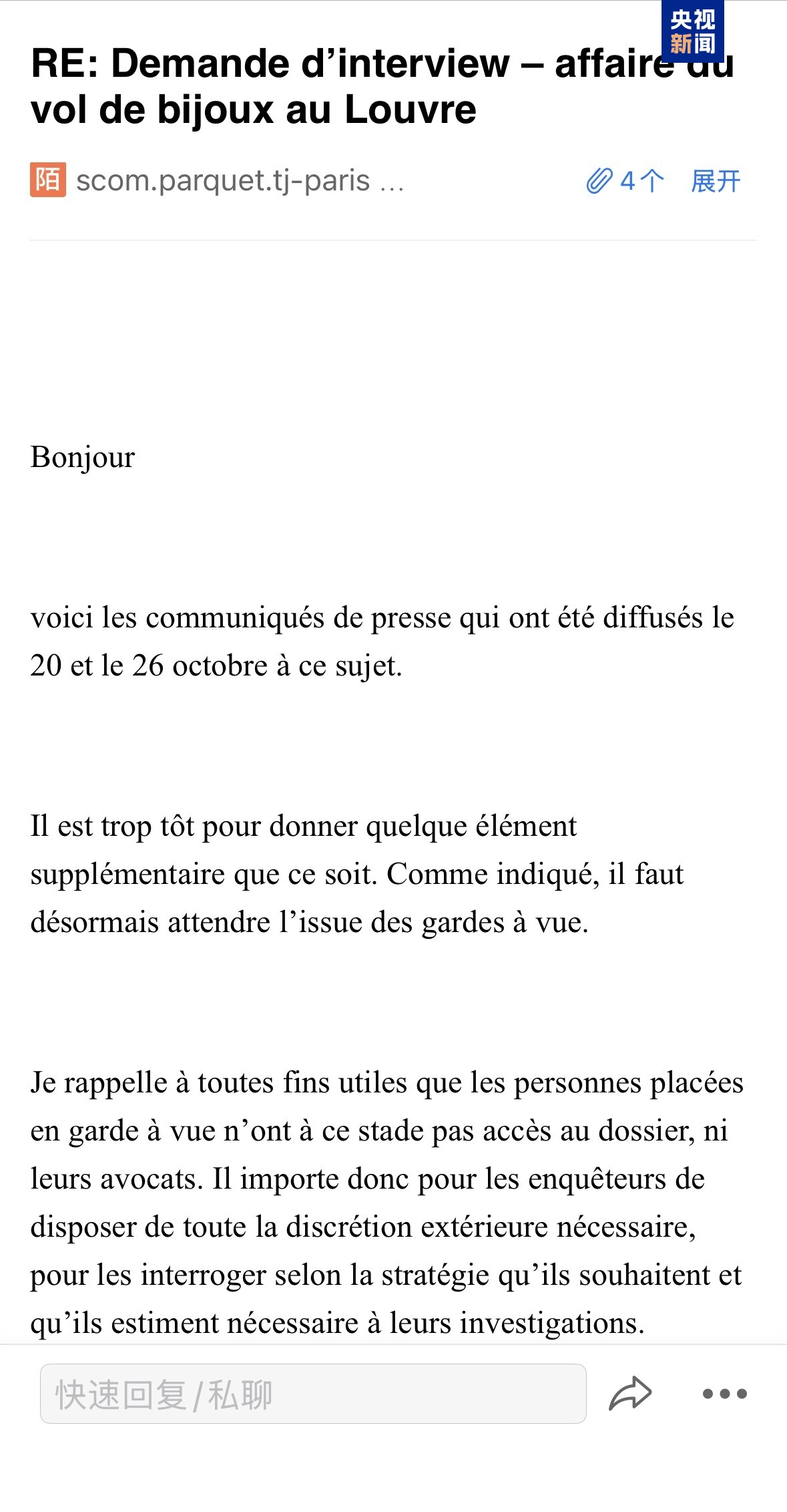 △巴黎检方发送给总台记者的邮件,表示目前尚无法公布更多案件细节。