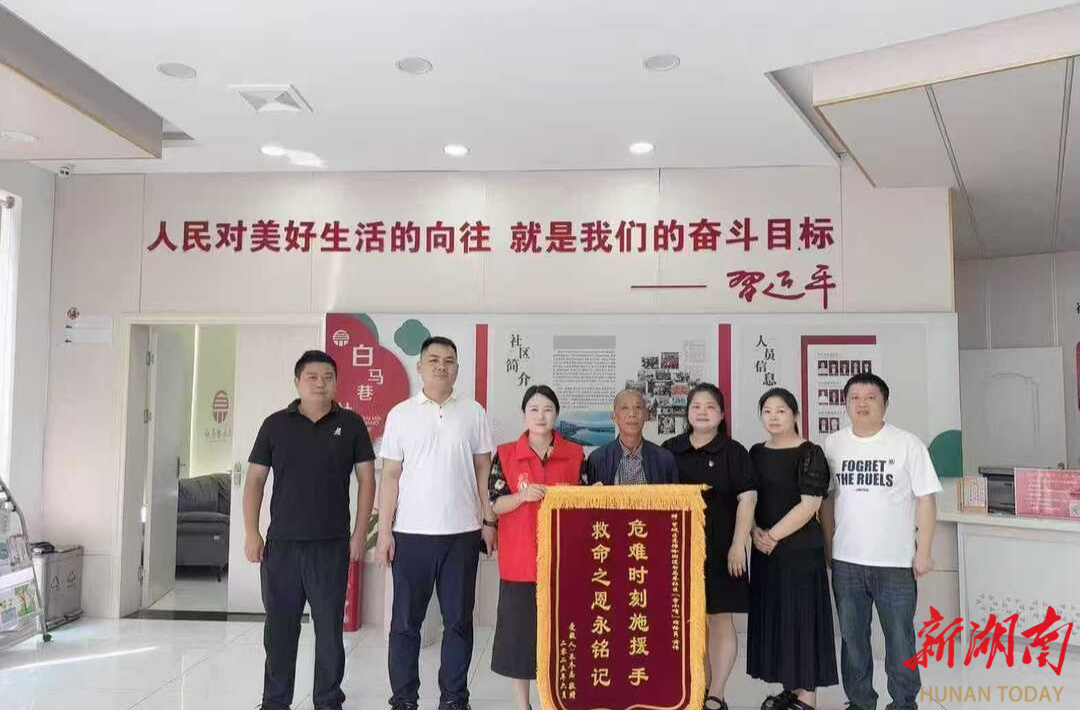 受救助的老人为白马巷社区“雷小哨”网格员黄伟送上锦旗