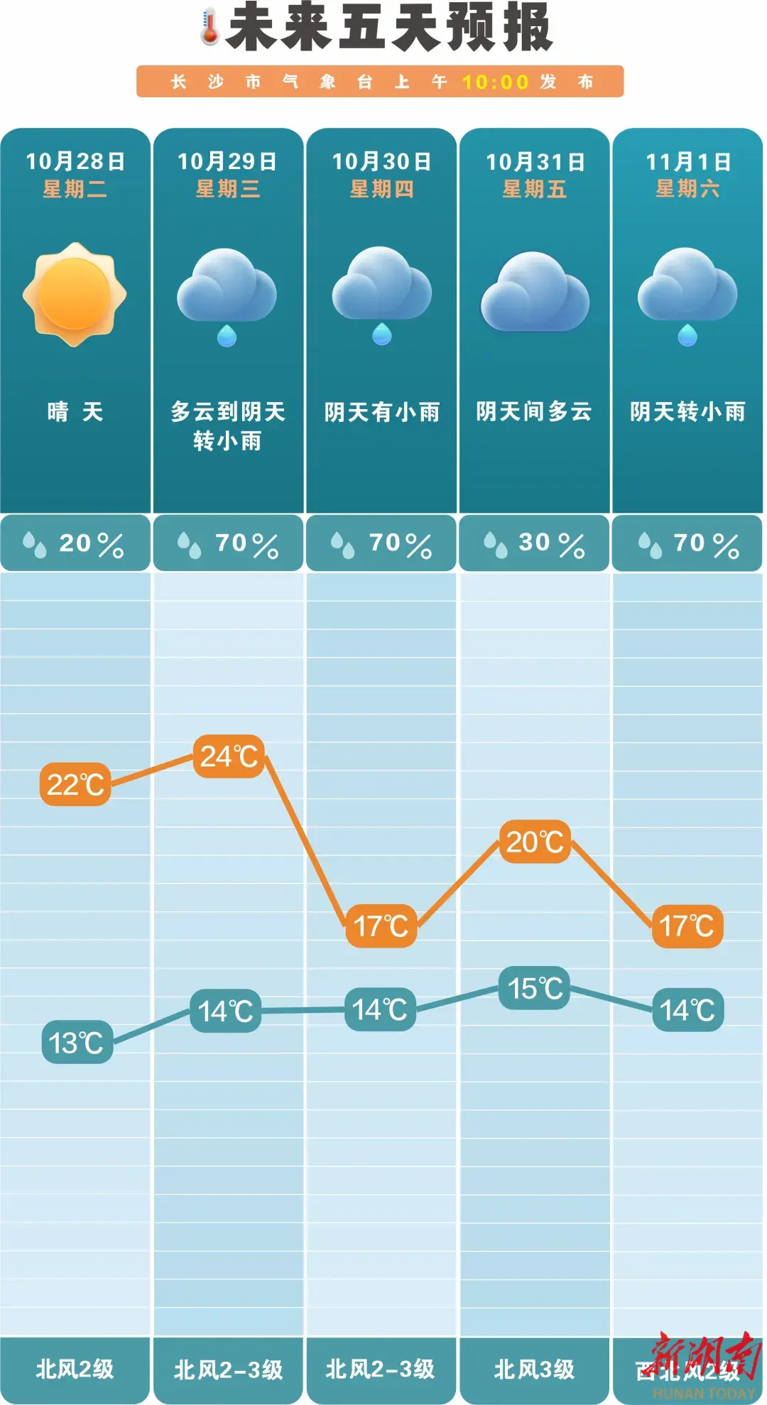 湖南日报·新湖南客户端10月28日讯(记者 谢璐 通讯员 吴瑕)今天,记者从长沙市气象局获悉 ,10月29日晚至11月2日,受弱冷空气和低层切变线共同影响,长沙有小雨,最高气温下降6~8℃。建议大家抓住最后两天晴天的尾巴,洗衣晒被、出门走走,同时提前备好雨具,薄外套也要随时准备,应对即将到来的阴雨和降温。