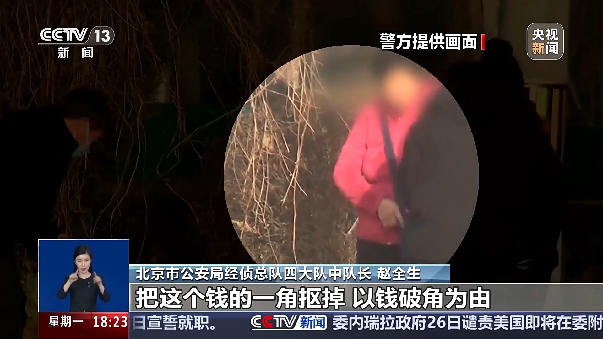 北京市公安局经侦总队四大队中队长 赵全生:老年人一般都会支付这种零钱,十块的,二十的,嫌疑人在收到这个钱之后,他迅速地用指甲盖儿把这个钱的一角给它抠掉,以钱破角为由,把钱再还给事主要求更换,事主再拿出其他的零钱进行购物的时候,他还以同样的手法撕角。直至老年人拿出自己手中的这个百元真钞交到嫌疑人手中之后,嫌疑人迅速地进行一个调包,声称太麻烦找不开,不行就还使刚才那个零钱,从中实现一个以假币换真币的这么一个手法。