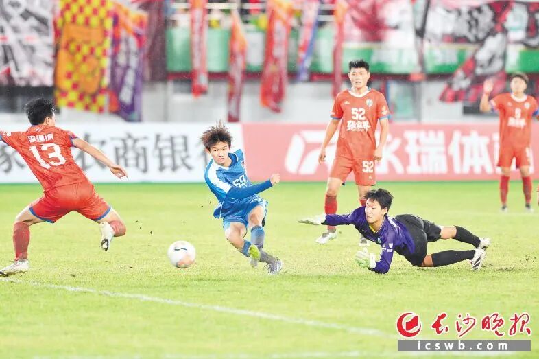 9月28日,湘超第三轮,长沙队客场对阵湘潭队,17岁的李悦宁(左)为长沙队先下一城。这一课,是关于“规则”与“尊重”的教育。