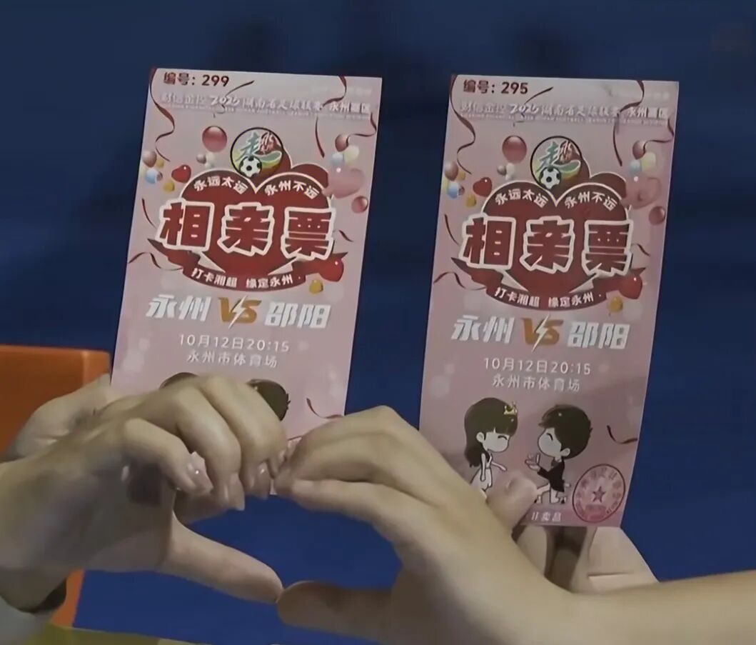 更绝的是,主办方顺势推出“相亲票”,专门划出一片看台给年轻人交友。手拿“相亲票”入场的观众可以在里边看球边交友。