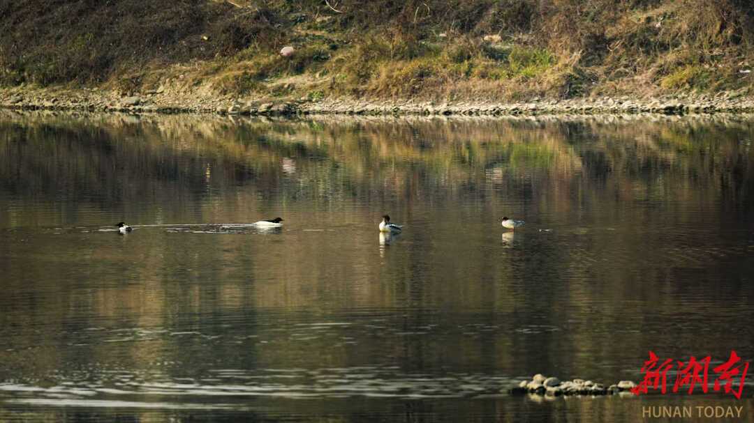 近年来,该湿地公园聚焦湿地生态保护修复,实施河道清淤疏浚、岸线生态护砌、乡土植物补种等工程,生物多样性显著提升 ——“鸟中大熊猫”中华秋沙鸭每年初冬准时来此,在江面潜水捕鱼;白鹭、池鹭等水鸟群集浅滩,晨起群飞、傍晚归巢;现有维管植物1230多种,其中野菱、水蕨等湿地特有植物长势旺盛;140多种“三有”保护动物在此栖息,形成“江畅、岸绿、鸟飞、鱼游”的和谐生态格局。2024年开放的洞口三桥段湿地净化园,通过狐尾澡、荷花、芦苇等水生植物协同净化水质,如今水质稳定达到Ⅱ类标准,既是生态修复示范样板,也是市民观鸟、散步、亲近自然的热门打卡地。