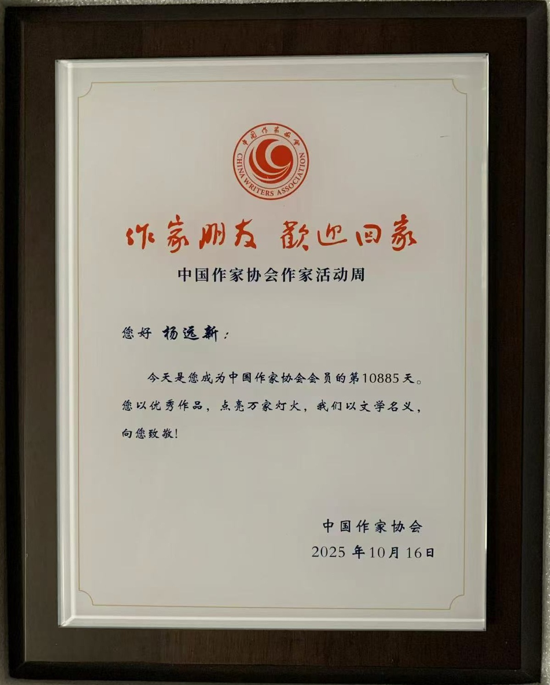 中国作协领导为37位作家颁发了中国作协特别定制的专属入会纪念牌,上面镌刻着大家迄今为止的入会天数。中国作协党组成员、书记处书记李一鸣为杨远新授牌。牌上镌刻:
