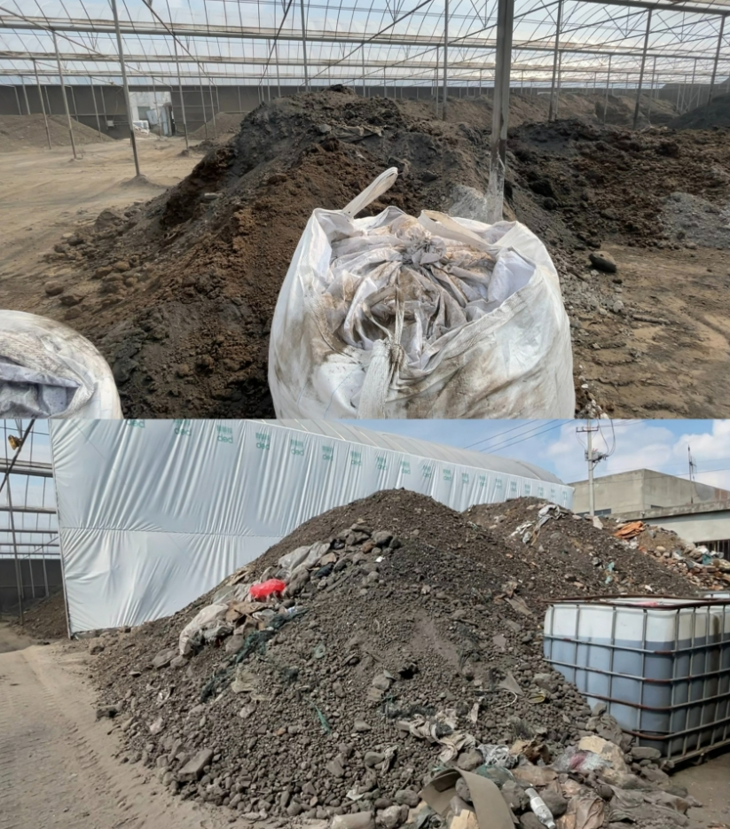 影子调查队在现场未见到任何无害化处置设备。厂里的简易大棚,堆放着各种棕黄、发黑的“营养土”原料、碎石;大棚后的一块空地,与旁边钢渣废料处理厂的空地相连,有挂车正在不远处卸炉渣;空地上同样露天堆着大量原料,未进行任何遮挡。