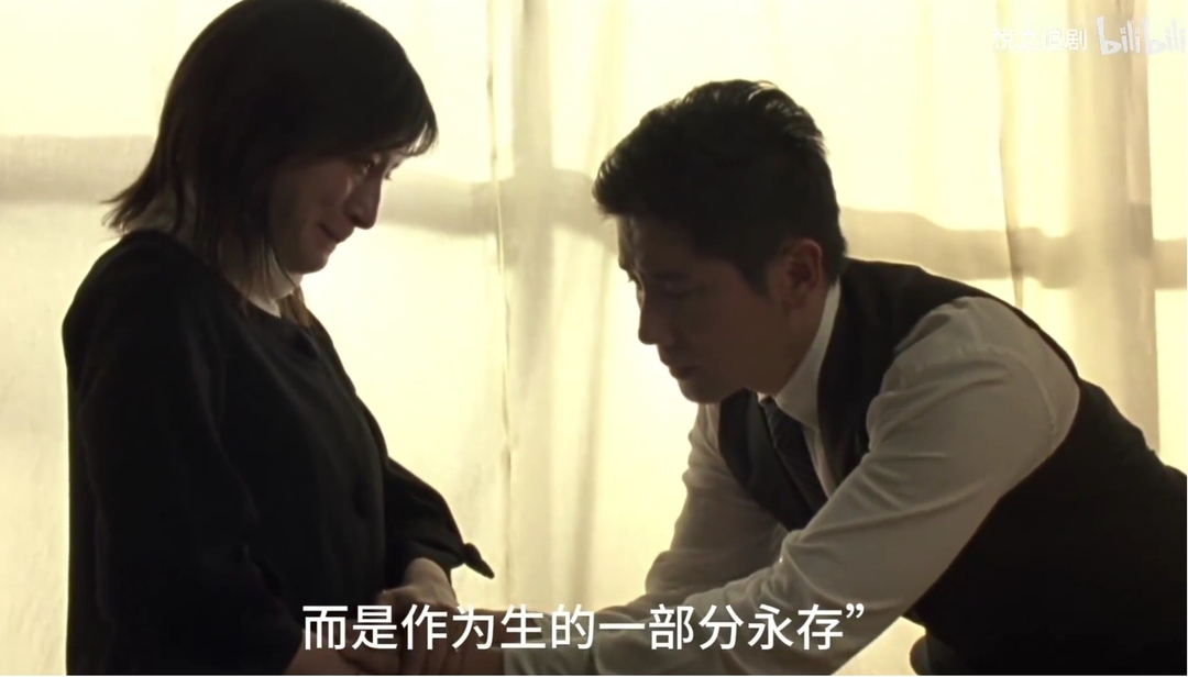 在电影《旁观者》的结尾,陈坤饰演的家辉从来电中揭晓父亲骨灰中融不掉的钢板的秘密,从此打开积郁多年的心结,放下对父亲的怨恨,与空间和记忆达成了艰难的和解,流着泪对自己的儿子说:“爸爸想爸爸的爸爸了”。