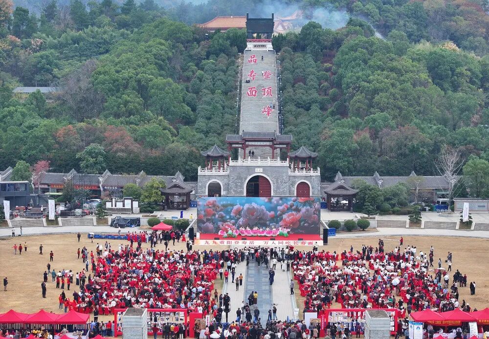 寿岳同祈:衡阳市南岳万寿广场热气蒸腾。当地举办 “九九重阳登寿岳·万人同吃长寿面”活动,百对金婚夫妇在千人见证下接过祝福证书。碗中面条绵长,寓意白首同心;身后寿岳苍翠,承载湖湘人对健康长寿的淳朴祈愿。曹正平 文兰 摄