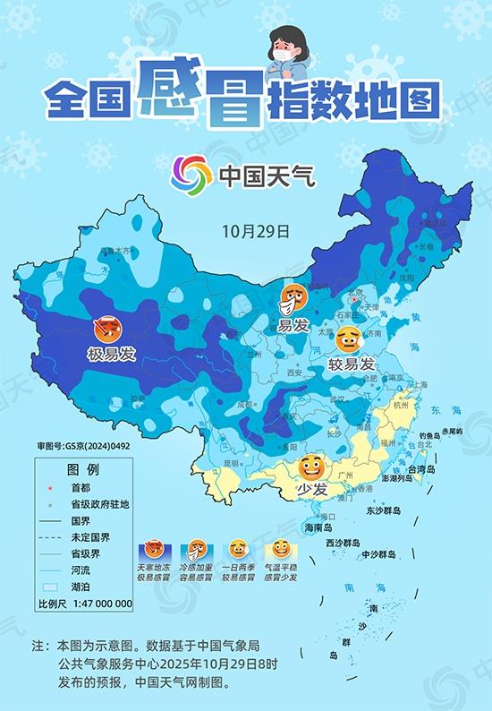 10月29日,内蒙古东部、黑龙江部分地区、青海大部、西藏西部、新疆南部等地天寒地冻,极易引发感冒,这些地方最高气温仅有个位数,最低气温普遍在冰点之下,寒冷感贯穿一整天。东北其他大部地区、华北北部、四川大部、贵州的部分地区冷感较重,容易感冒。大城市中,哈尔滨今起至周末最低气温都在冰点之下,其中今明天仅有-3℃,寒意十足,需做好保暖措施防感冒。