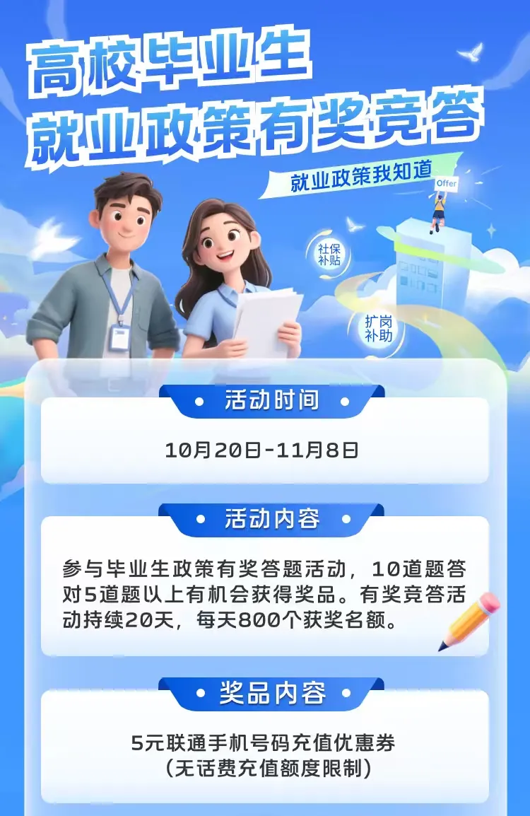 本次活动重点面向2026届高校毕业生,聚焦毕业生关心的基层就业、创业政策、就业见习、职业培训等政策,设计竞答题目,旨在帮助广大高校毕业生学习理解各项就业创业扶持政策。