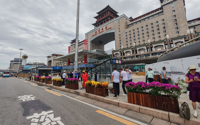 △北京西站北广场前,原先路边的护栏替换为花箱,方便送站车辆落客。北京市重点站区管委会供图