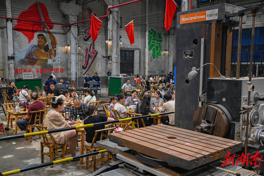 同样由老厂房改造而来,位于华驿·飞碟营地内。低至8元无限续杯的湘茶搭配小吃,性价比极高。宽敞大厅和陈列的老机械区,能让长辈们一边闲逛、一边聊天,惬意又自在。