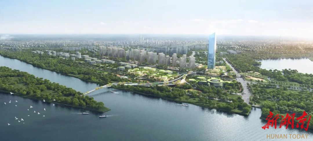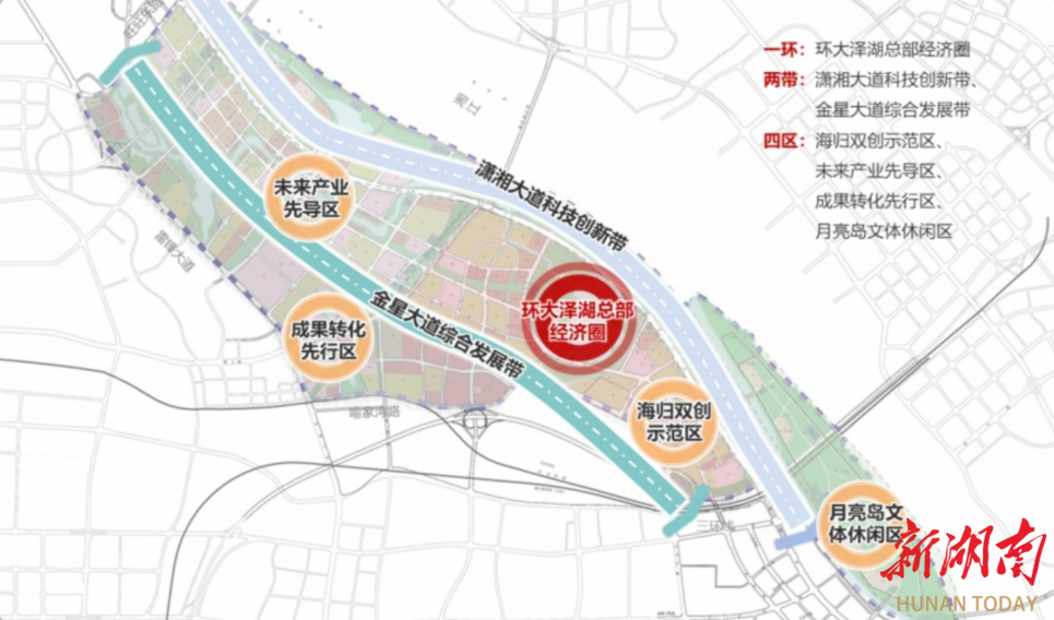 大泽湖不仅有近3000亩湿地公园作为生态封面,更有“一环两带四区”的清晰规划:环大泽湖总部经济圈集聚科技型企业总部,潇湘大道科技创新带布局高端研发平台,金星大道综合发展带串联国际社区与高端商业。
