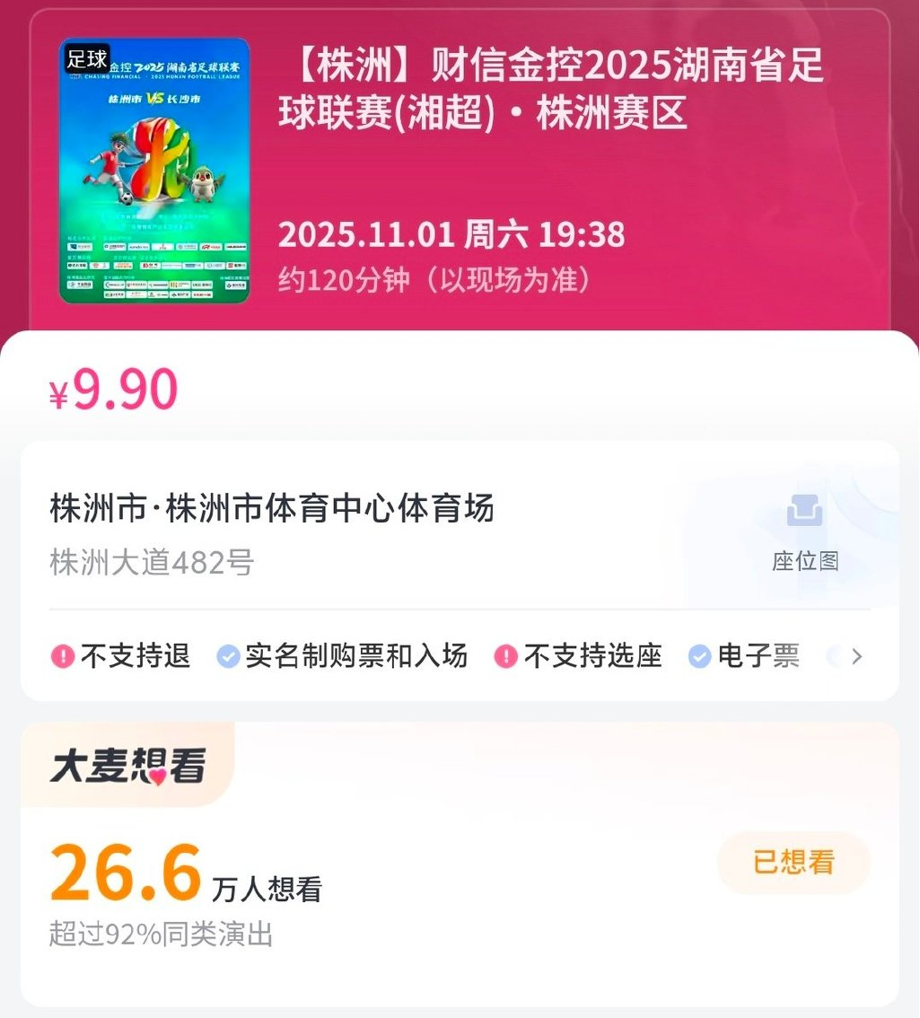 大麦网超26万人在线抢票的数据,彻底刷新了“湘超”单场比赛预约观赛人数的新高。不少网友戏称这场比赛不仅仅是榜首之争,也是“手足相争”“长株潭德比”。