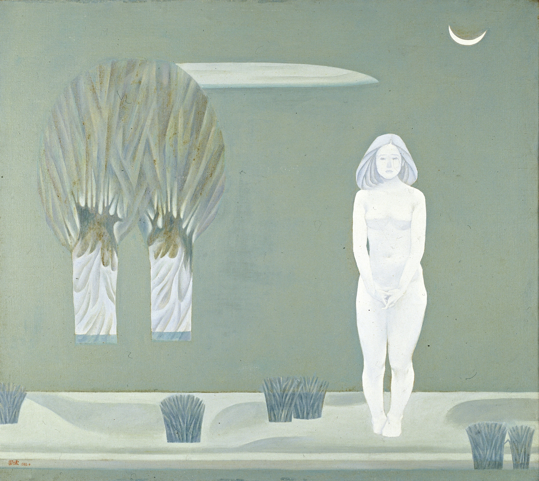 但在他早期的油画里,树是更加抽象的符号化的。抽象油画强调主观表达形式创新与情感宣泄,正符合青年期的个体对独特性和自我认同的追求,也暗含着画家早年通过简化形式来强化个人视角的途径,通过艺术解构世界,确立自我。同时,湖月等元素常被视为潜意识的原型象征(荣格理论中的“阿尼玛”或“自性”),反映画家对内在世界的深度探索。