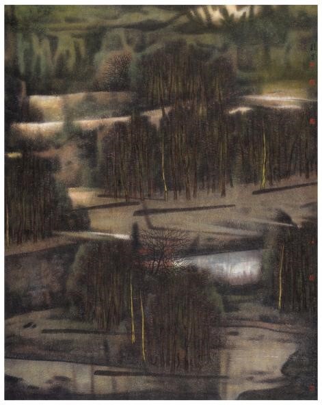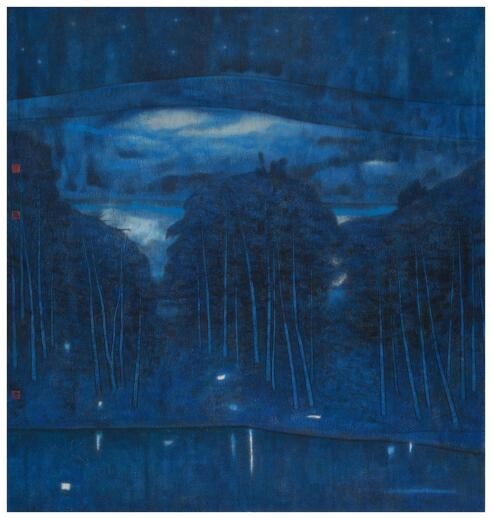 中年时期转向水墨画后,仔细去看,他的画面里,极少再有孤独的符号化的树。从画家此时青翠茂盛的内心世界出发,它们总是成片地蓬勃地生长,带着近乎野性的生命力。青绿山水作为传统水墨画的重要分支,强调秩序感层次感与自然和谐,暗示画家进入中年后对文化传承精神归属的追求,借助传统山水重构秩序,寻求超越与安宁。