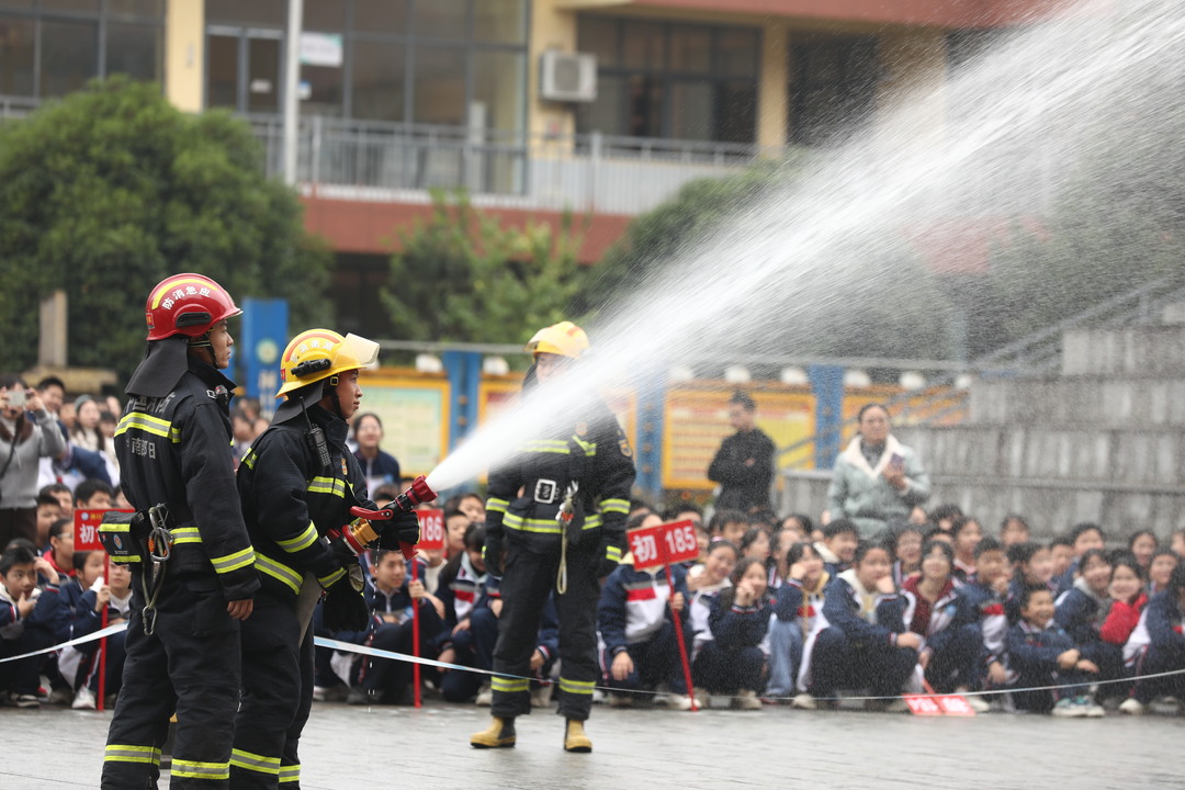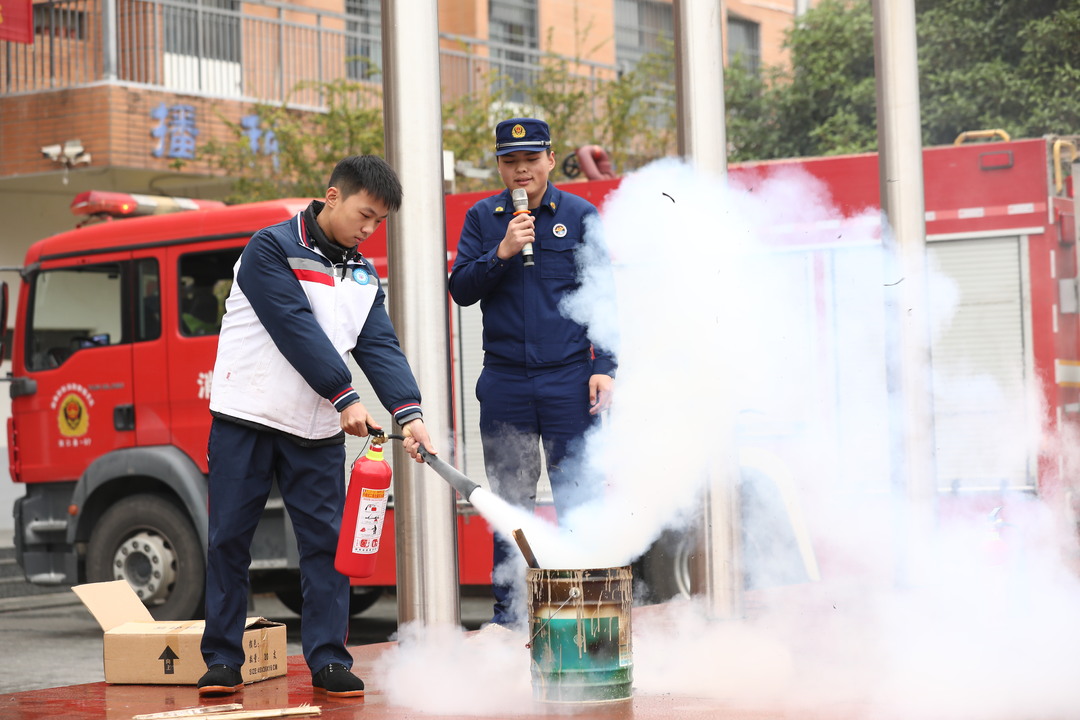 疏散完成,学习继续。洞口县雪峰消防救援站的指战员们早已严阵以待,为师生带来一场生动实用的“安全公开课”。消防员现场演示消防水枪操作,水流精准喷射,引来阵阵惊叹;副站长沈安鸿结合真实案例,深入浅出地讲解了火灾预防与逃生要点,语言通俗、内容扎实。在灭火器实操环节,“提、拔、握、压”四字要诀被逐一演示。多名学生受邀上场,亲手操作,将课堂知识转化为实战技能,现场互动积极,气氛热烈。