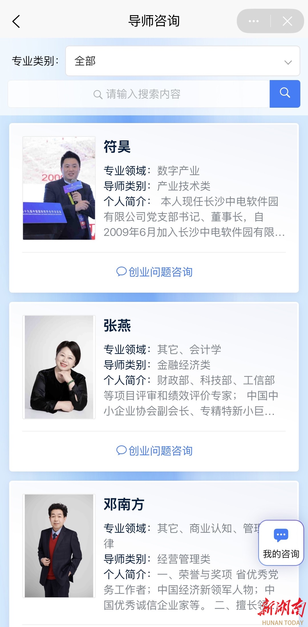 无论是产业技术、金融经济还是经营管理领域的专家,如中电软件园董事长、财政部评审专家等,你都可以通过“导师咨询”通道“一键提问”。
