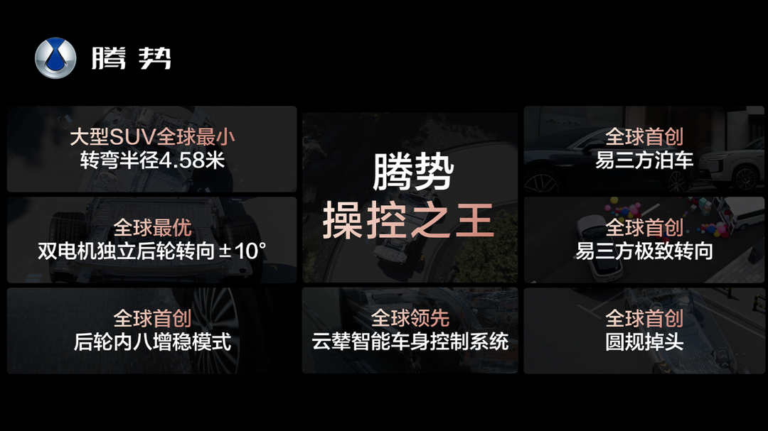 一系列硬核科技的加持,让腾势N8L成为了家用SUV中的操控之王。它全系标配“易三方”整车智能控制技术平台,全球首创圆规掉头、极致转向、后轮内八增稳、易三方泊车等功能,后轮双电机独立驱动带来了最大±10°的后轮转向角度,全球最优,转弯半径最小仅有4.58m,是大型SUV中的全球之最。