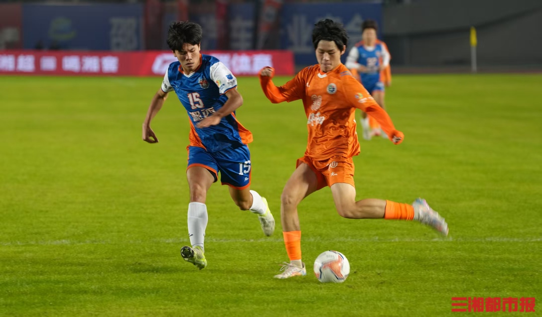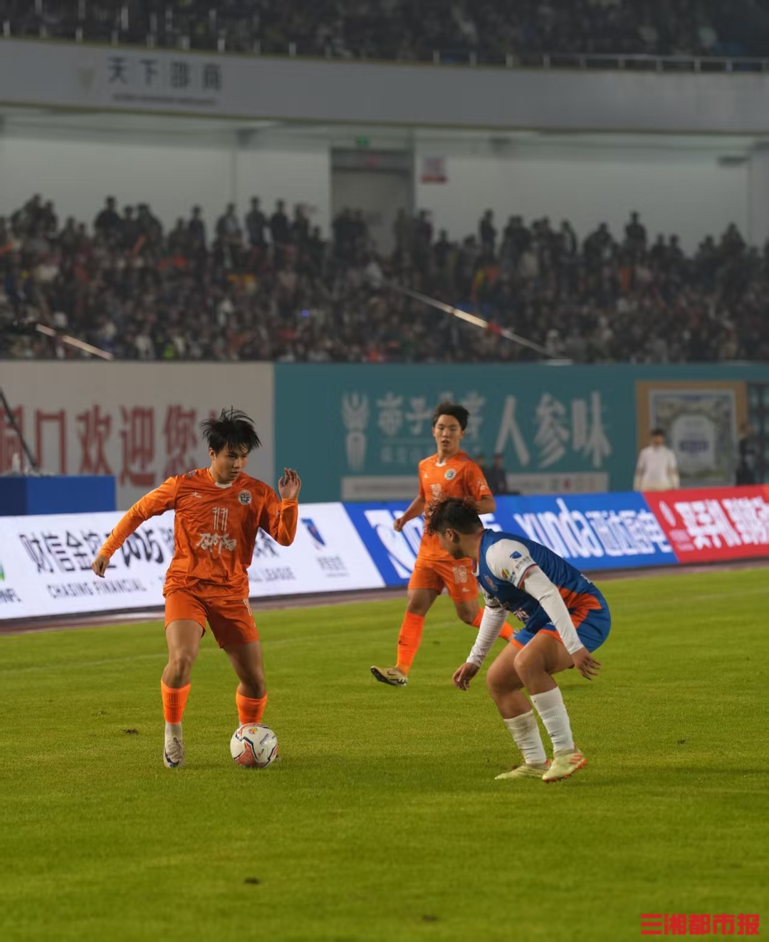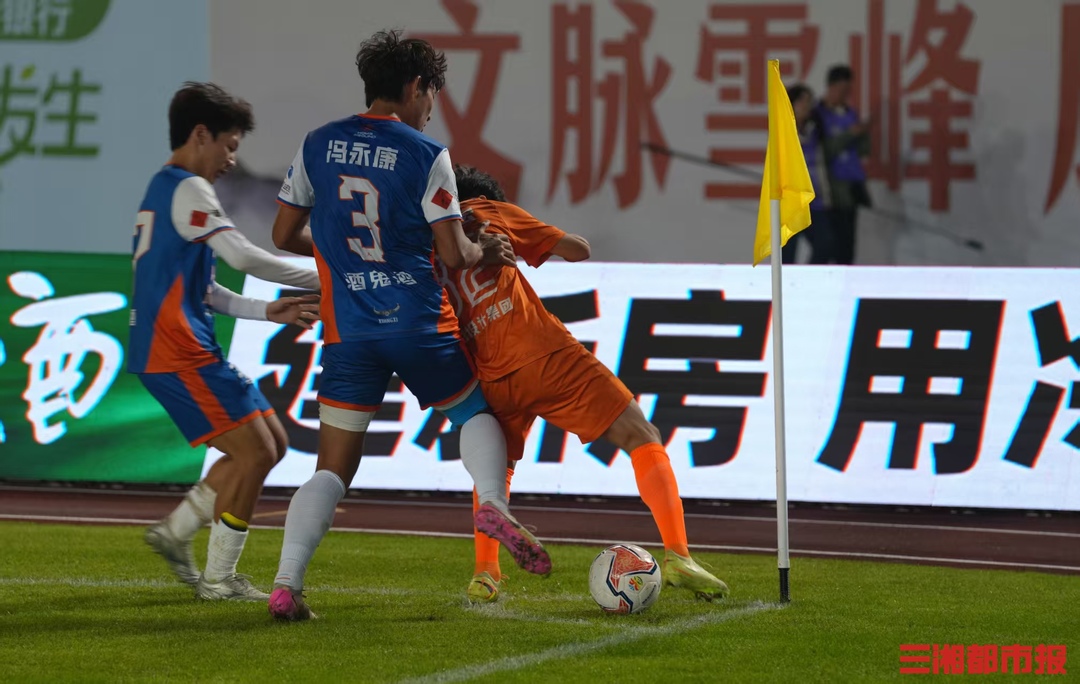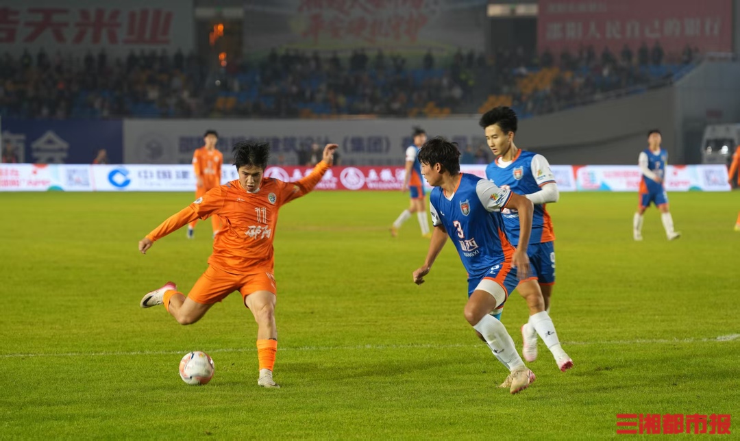 狭路相逢勇者胜,11月16日晚,身穿橙色球衣的湘超邵阳队终场前制胜湘西队。双方激烈比拼互不相让,直至上半场结束,均没能找到进球的机会。下半场第81分钟,邵阳队18号球员孙利俊雄踢入关键一球,获得了整场比赛的胜利。(全媒体记者 昌小英 李致远 张浩 黄亚苹 袁红霞 顾荣 周洋)