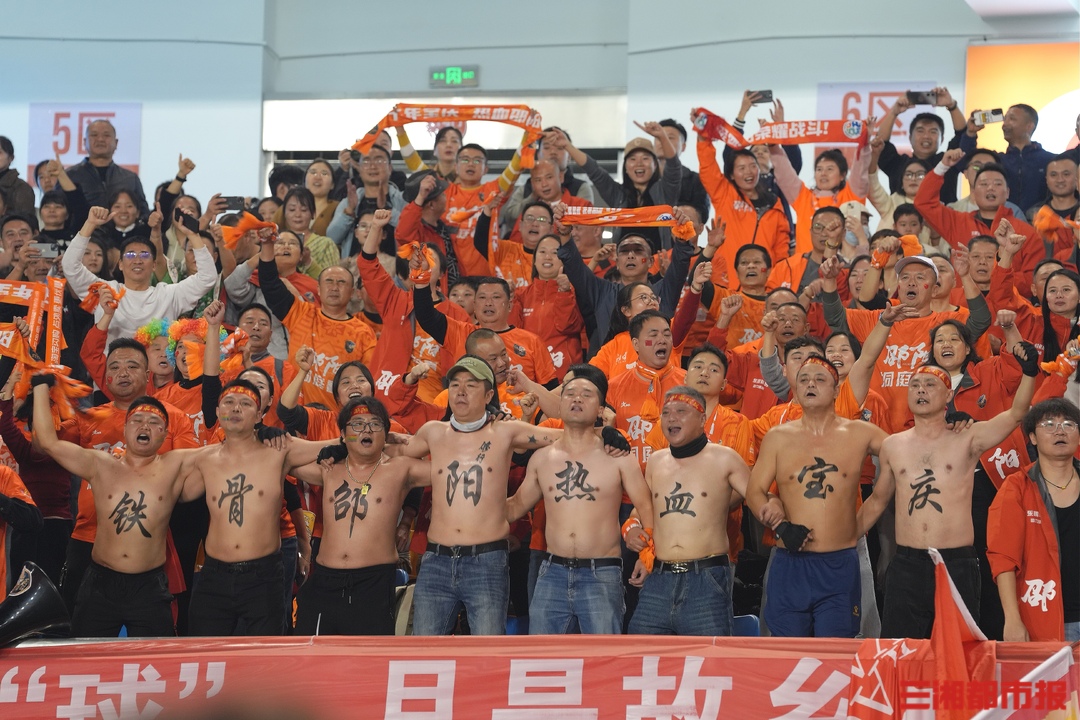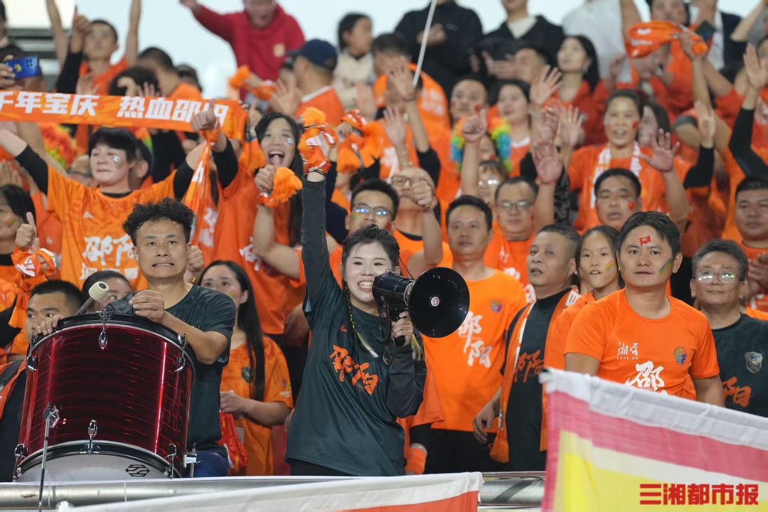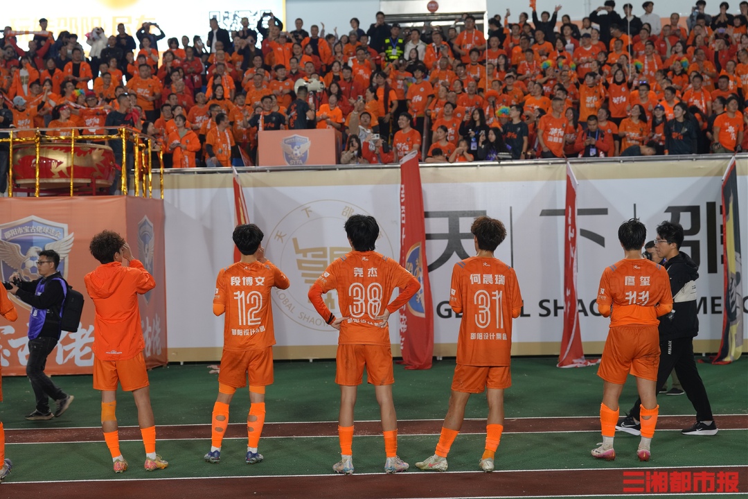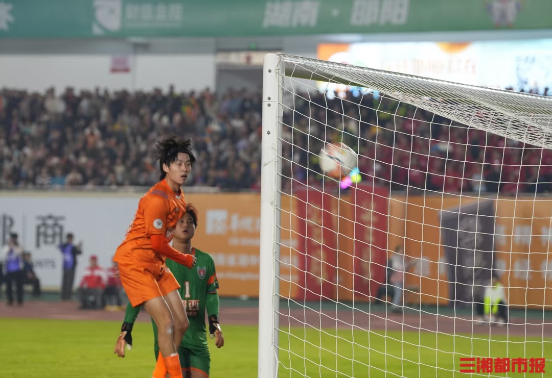 狭路相逢勇者胜,11月16日晚,身穿橙色球衣的湘超邵阳队终场前制胜湘西队。双方激烈比拼互不相让,直至上半场结束,均没能找到进球的机会。下半场第81分钟,邵阳队18号球员孙利俊雄踢入关键一球,获得了整场比赛的胜利。(全媒体记者 昌小英 李致远 张浩 黄亚苹 袁红霞 顾荣 周洋)