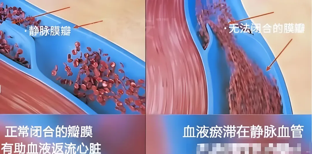 我们的心脏像泵一样,把血液通过动脉输送到双腿,而血液又会顺着静脉再流回心脏。我们腿上的静脉血管里,有一种像“单向阀门”(专业叫静脉瓣膜)的东西,它们保证血液只往心脏方向流,不倒灌。如果这些“阀门”关不严实了,血液就会往下逆行并淤积,血管就会被撑得鼓起来、变弯曲,就成了我们看到的“蚯蚓”。