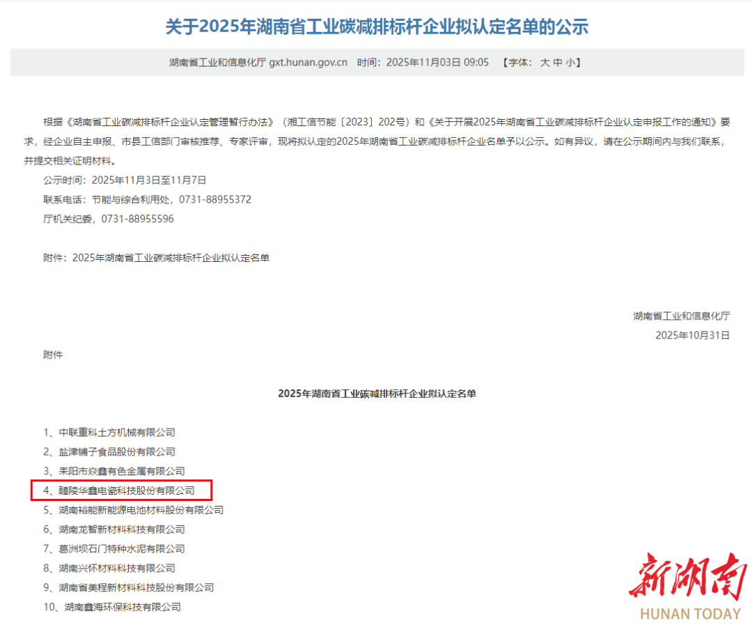 湖南日报·新湖南客户端11月17日讯(通讯员 许箐)近日,湖南省工业和信息化厅公布了2025年湖南省工业碳减排标杆企业名单,共10家企业上榜。其中,醴陵华鑫电瓷科技股份有限公司成功入选。
