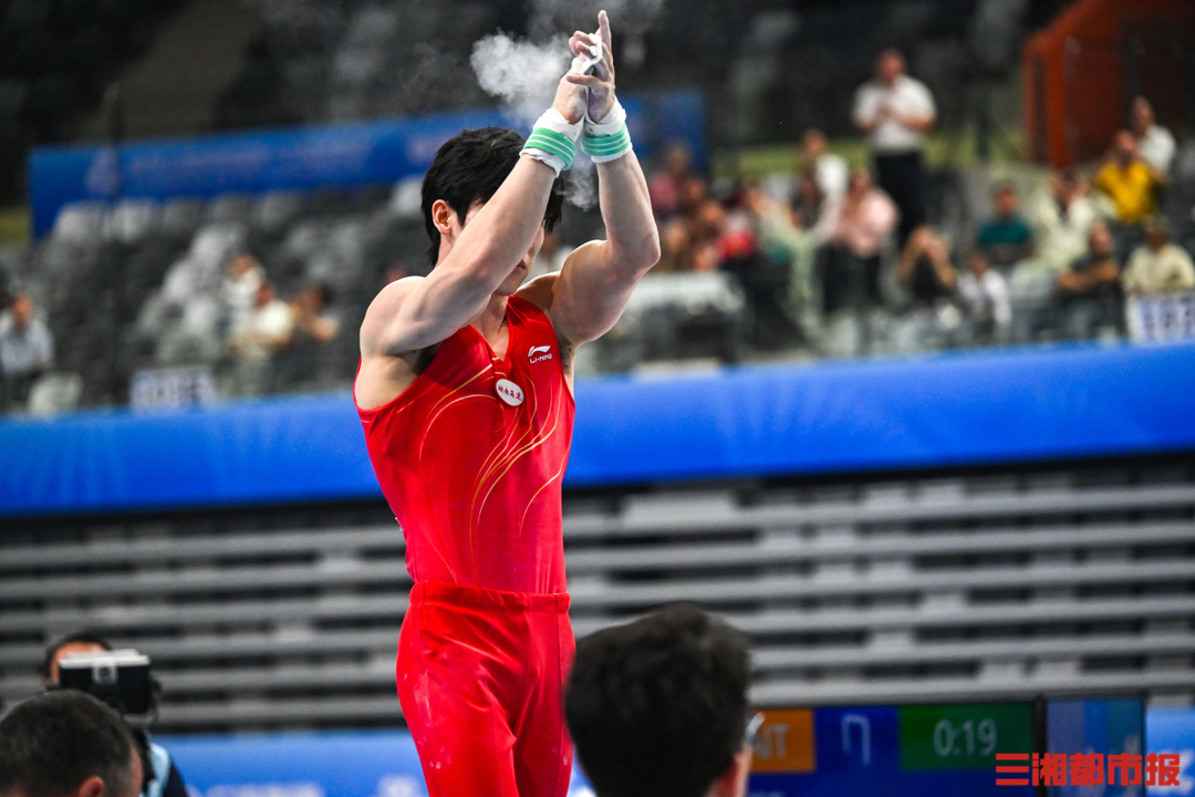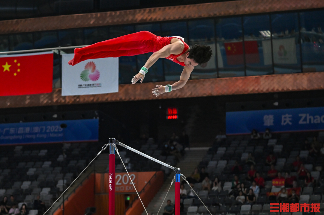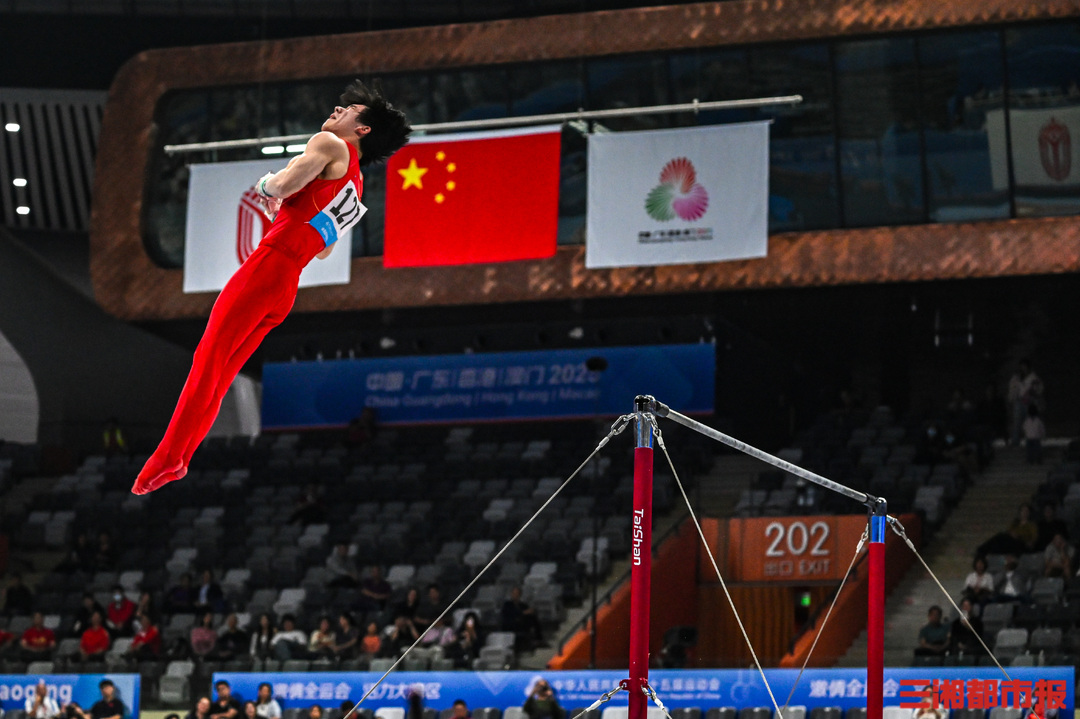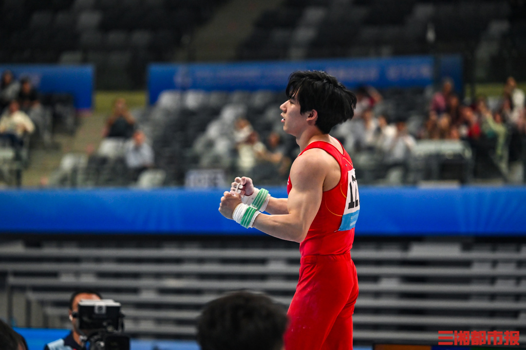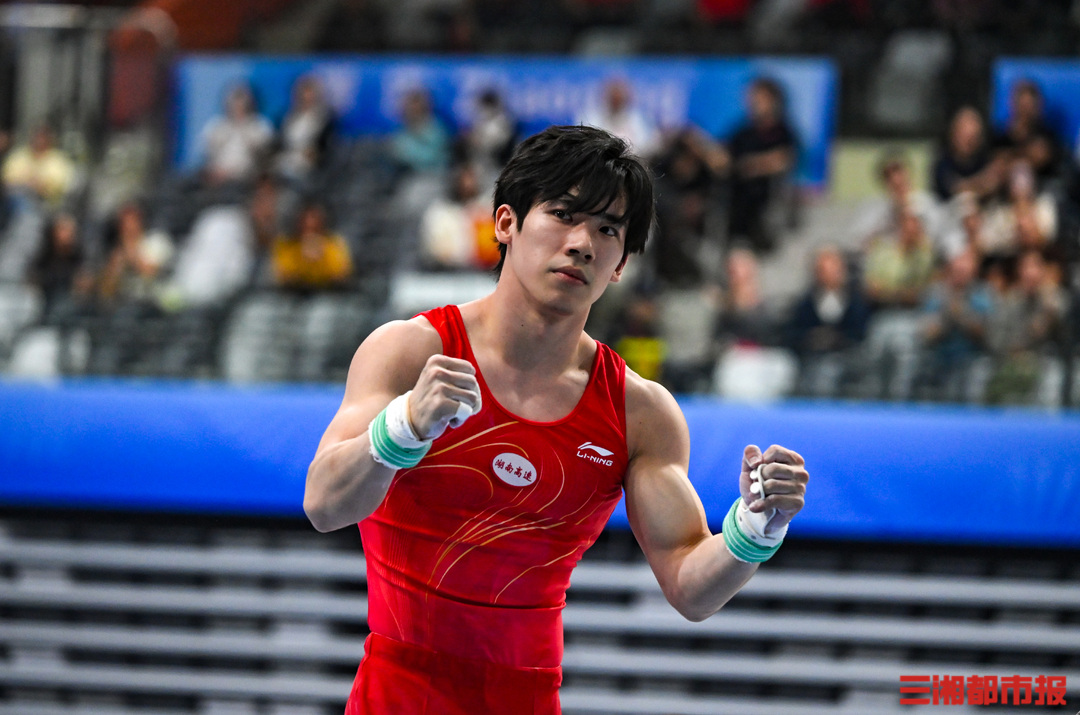 11月17日晚,广东肇庆新区体育中心,第十五届全运会男子体操单杠决赛,湖南长沙伢子张博恒在自己的强项中完成高难度动作,以6.2难度分,8.560完成分,0.1加分,获得总分14.860分。张博恒稳稳落地后霸气挥拳,并向来现场为他加油鼓劲的观众鞠躬致谢。最终,张博恒也凭此获得了自己的首个全运会冠军。