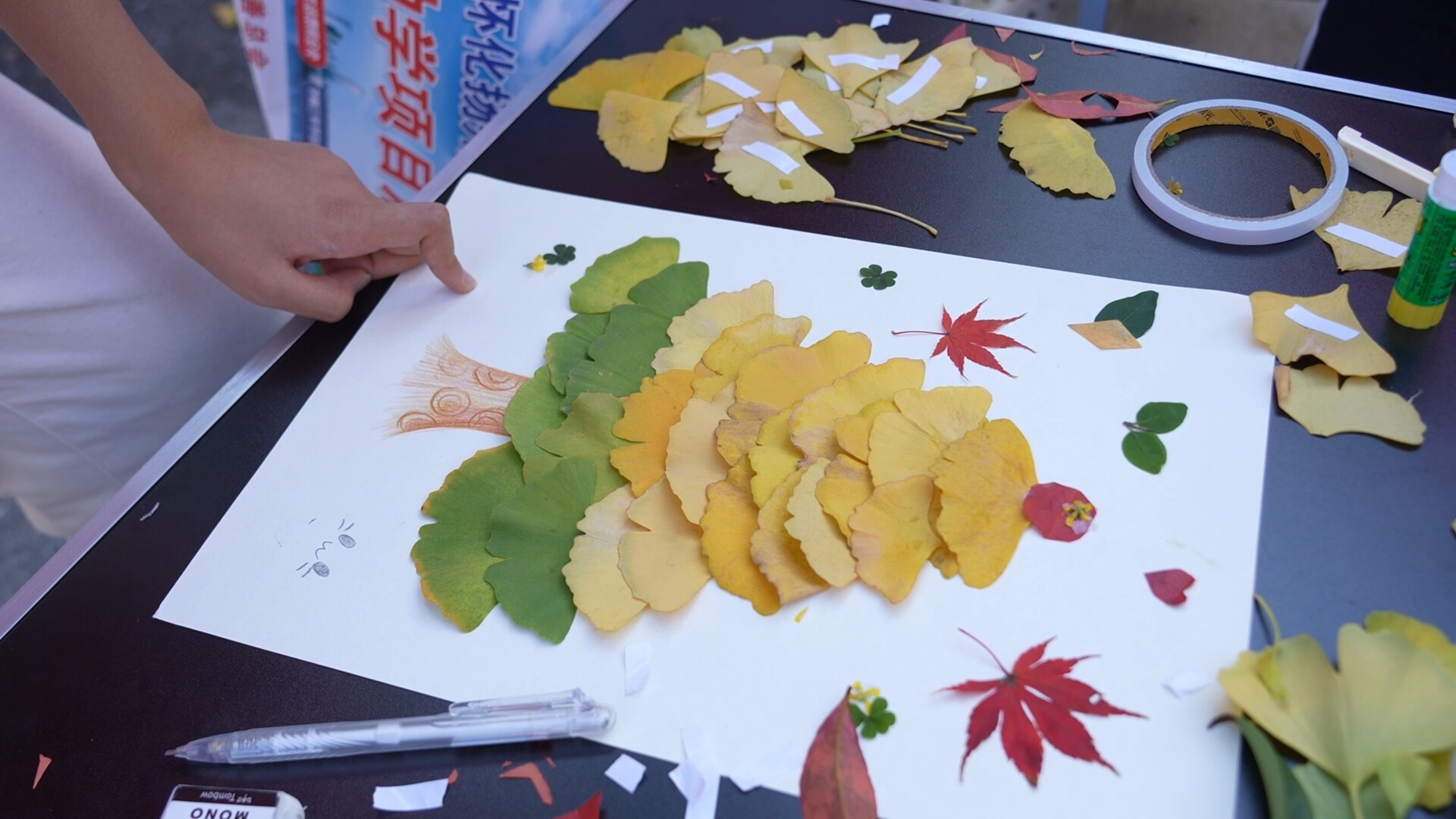 “我创作的是一棵圣诞树,红色的是枫叶,这个小叶子是幸运草,圣诞树的主体部分是用的银杏叶做成的。”中方县芙蓉学校学生郭馨彤展示着自己刚刚创作的作品,脸上满是自豪。