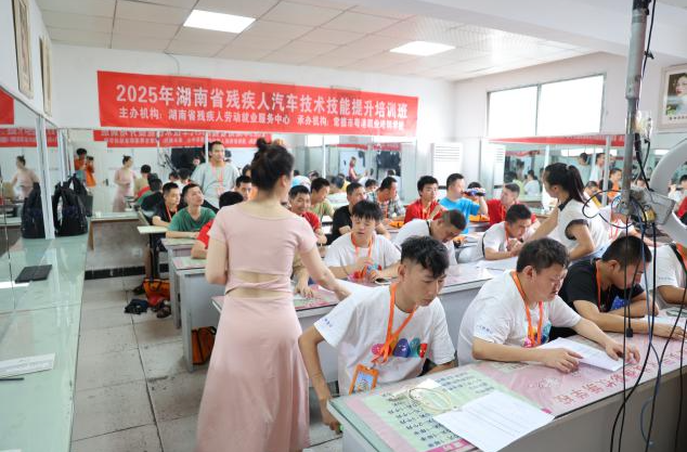这群平均年龄20余岁的年轻人,是湖南省残疾人汽车技术技能提升培训班的学员,如今已通过系统培训与考核,在这家汽车服务中心稳稳就业。
