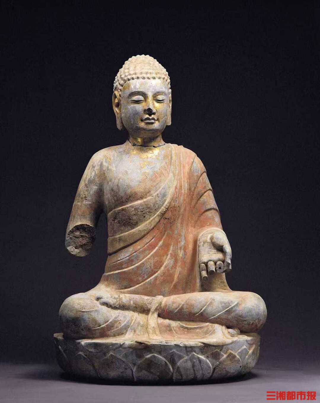 第二件展品来自青州市博物馆的贴金彩绘佛坐像,是青州窖藏造像中极为少见的坐姿形态。面相端圆、眼角微扬、嘴角含笑,既有出尘之静,也富温暖世俗气息。