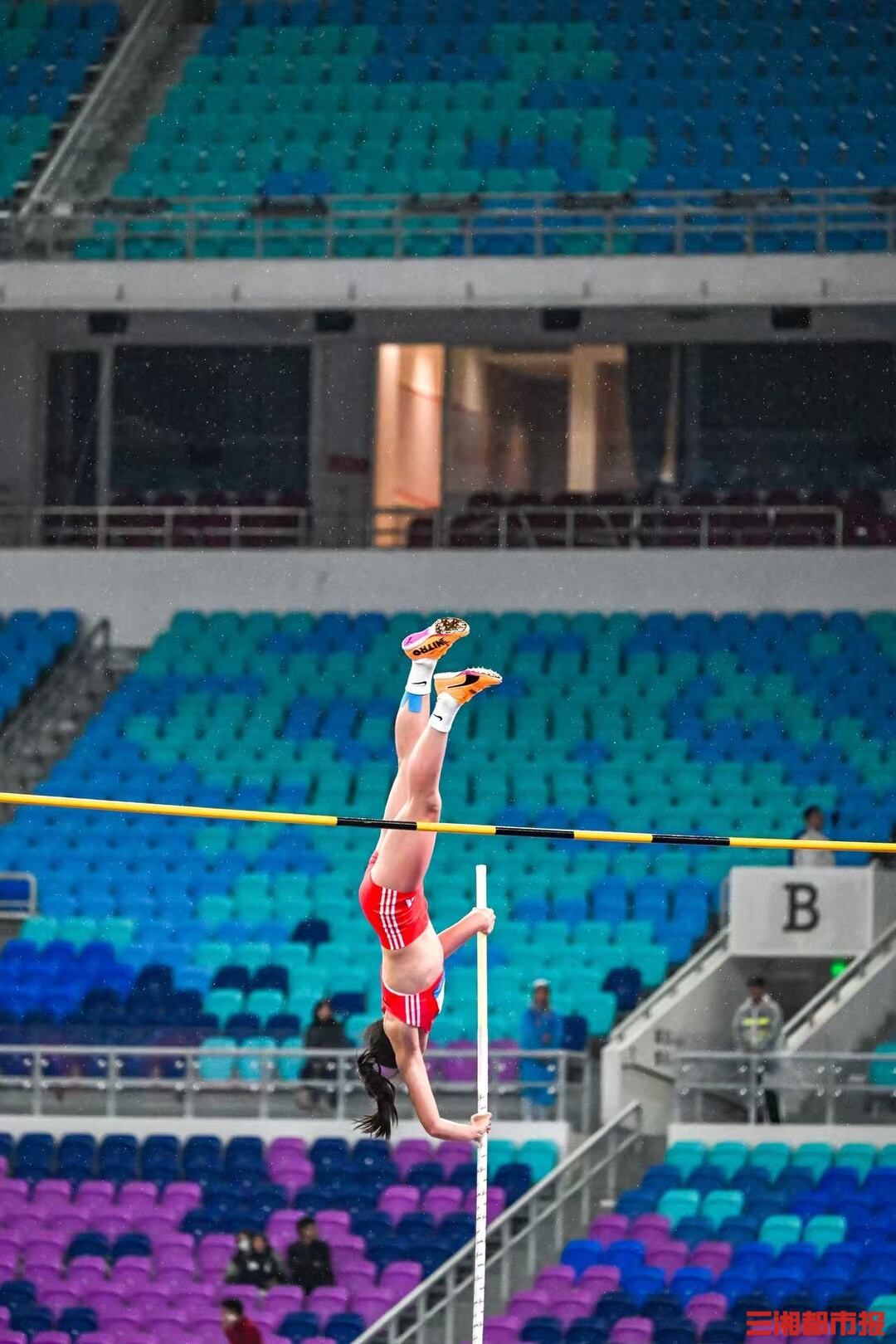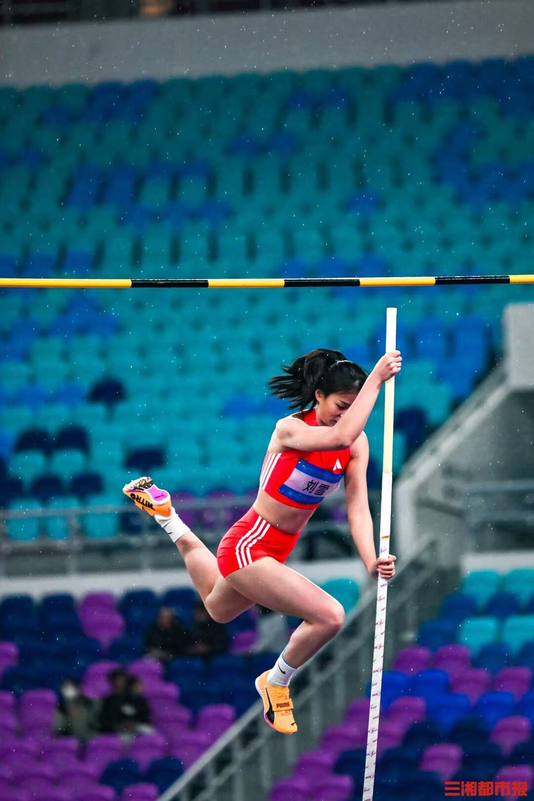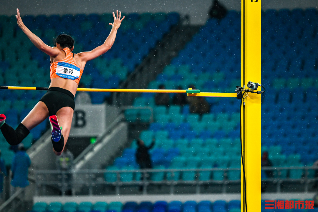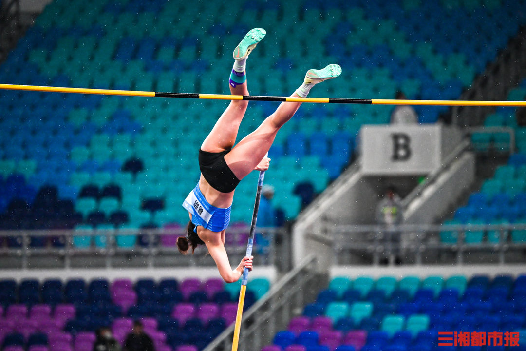 11 月 18 日,女子撑竿跳高决赛在广东省奥体中心体育场举行。压弯的撑杆似满弓,赛场上的选手英姿飒爽。(全媒体特派记者 刘丰 叶竹)